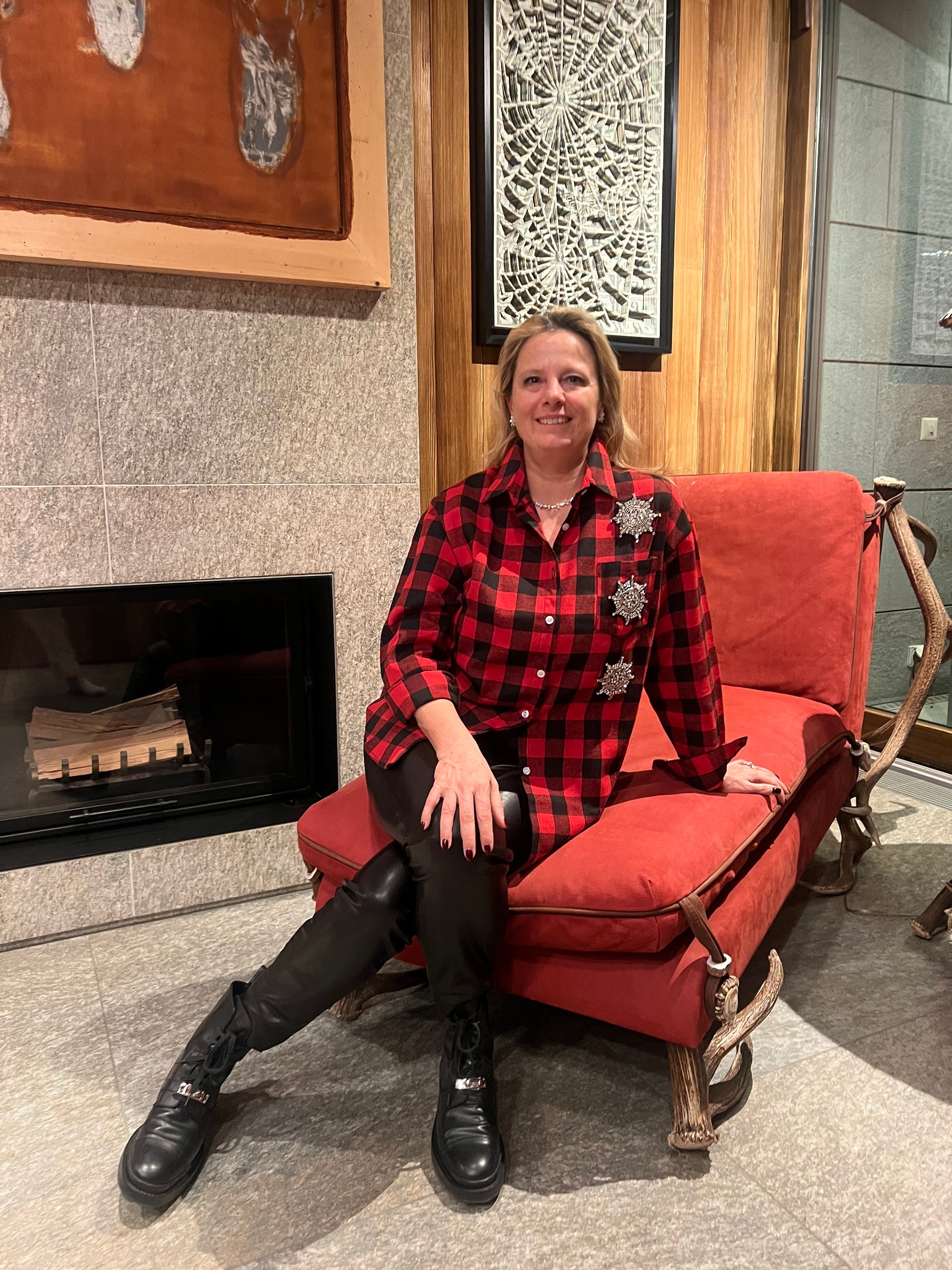 Camicia in morbida flanella rossa a quadri neri con due applicazioni in strass a forma di fiocco di neve sul davanti