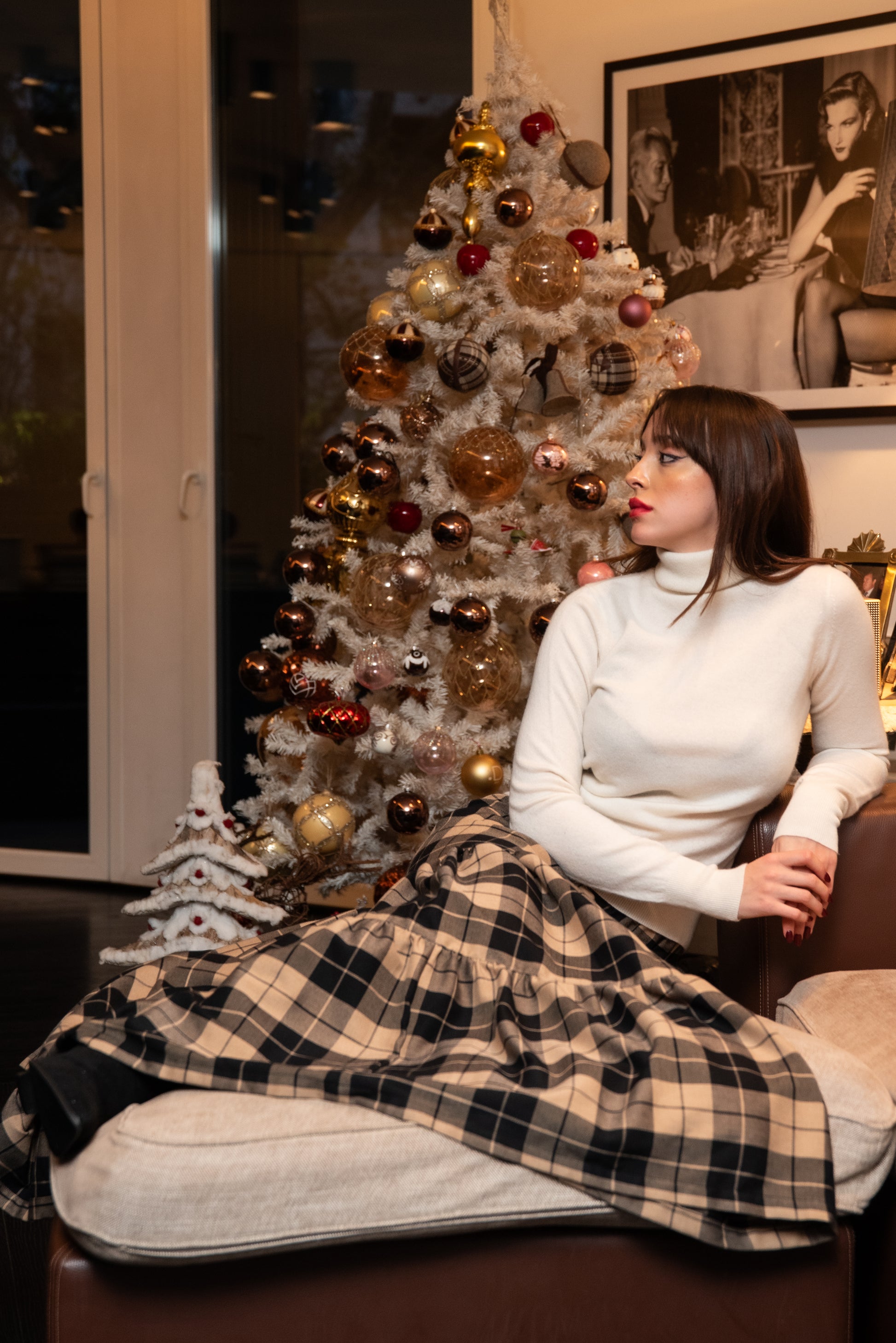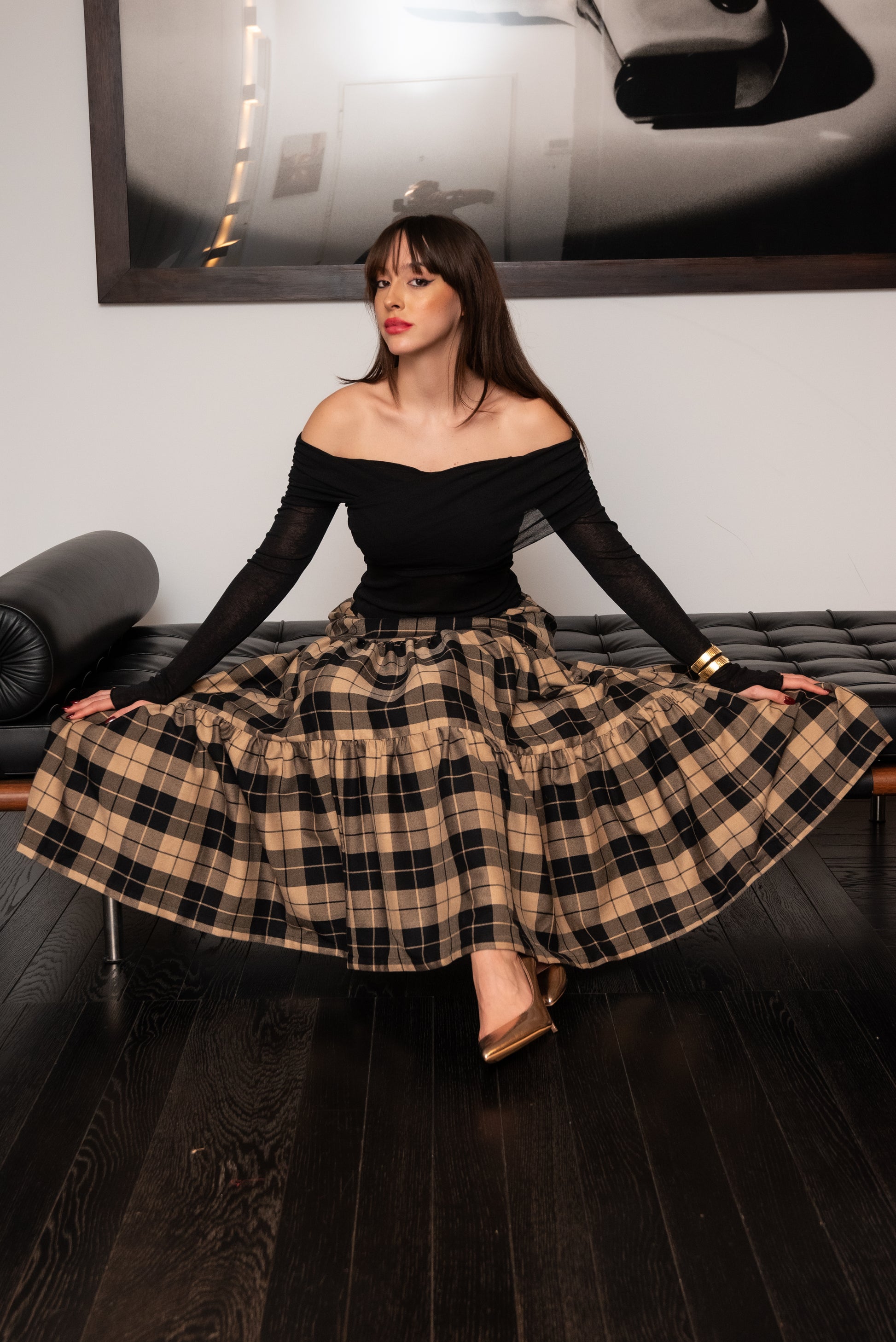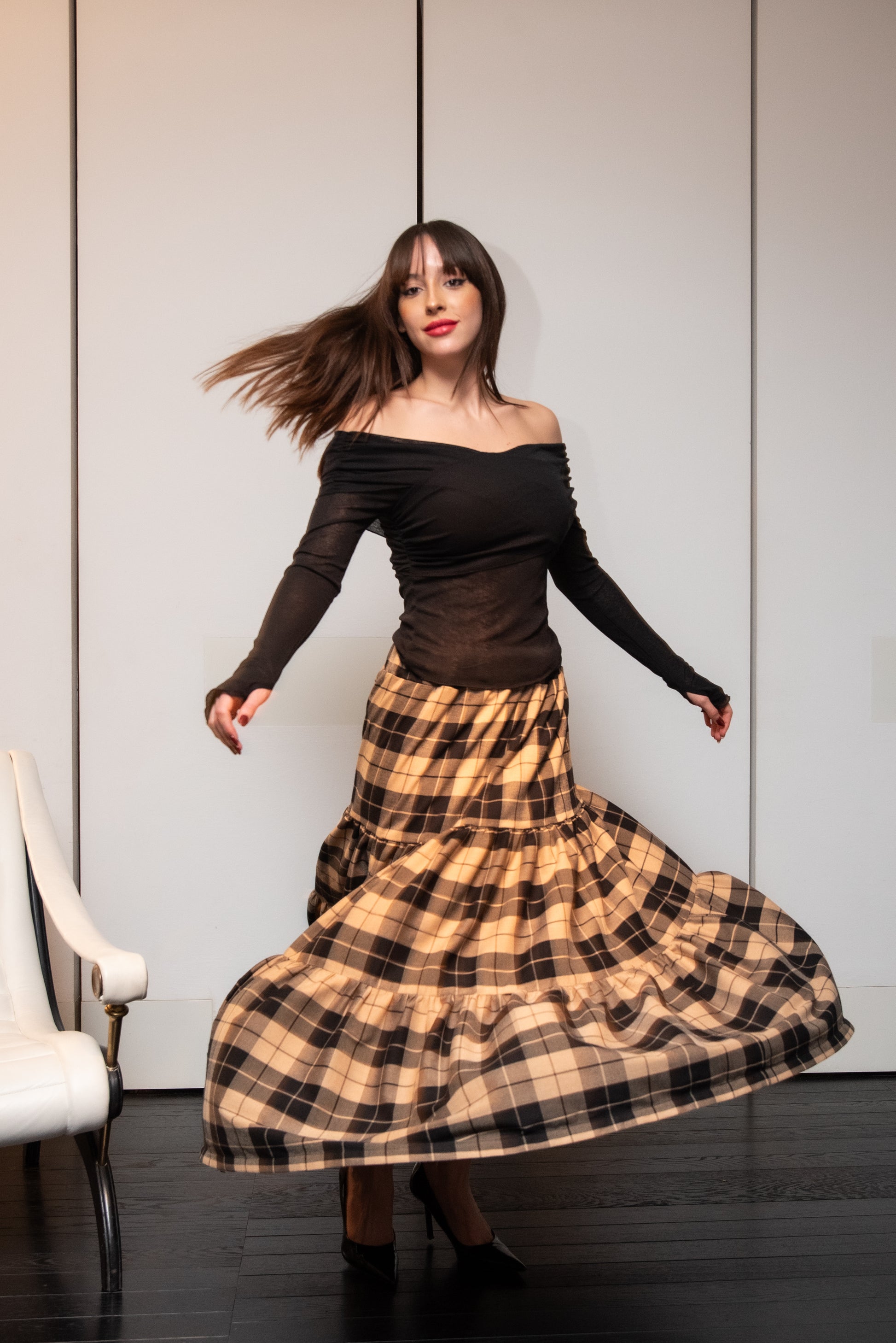 Maxi Gonna modello Franci a tre balze con elastico in vita e con profondo spacco in morbido tessuto scozzese.
