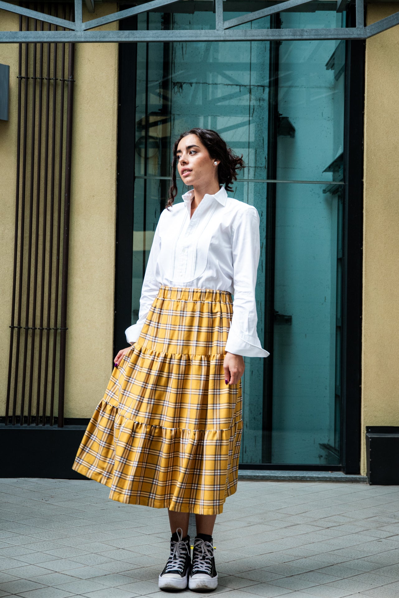 Gonna Midi’ modello Franci a tre balze con elastico in vita e in morbido tessuto scozzese.
