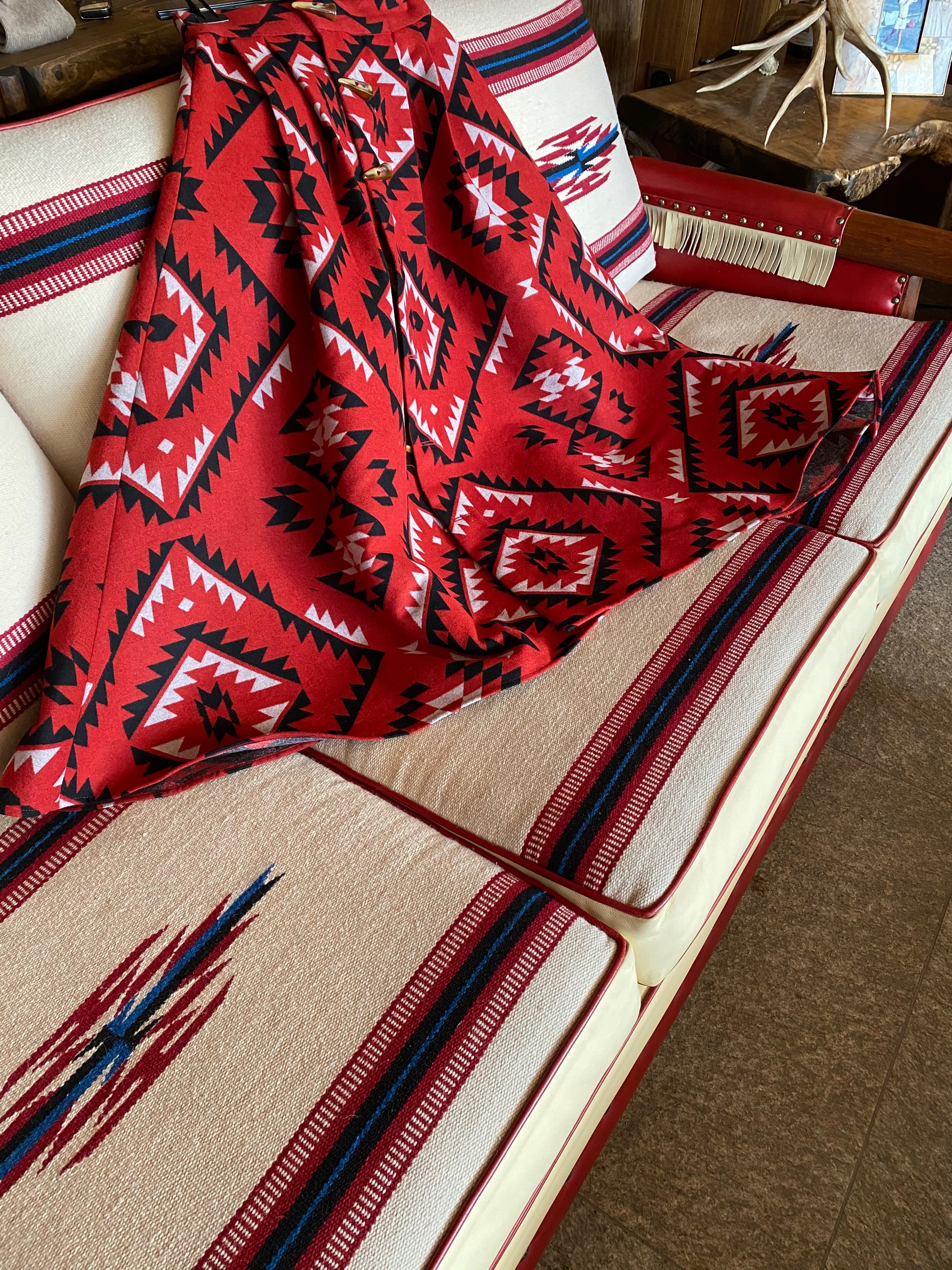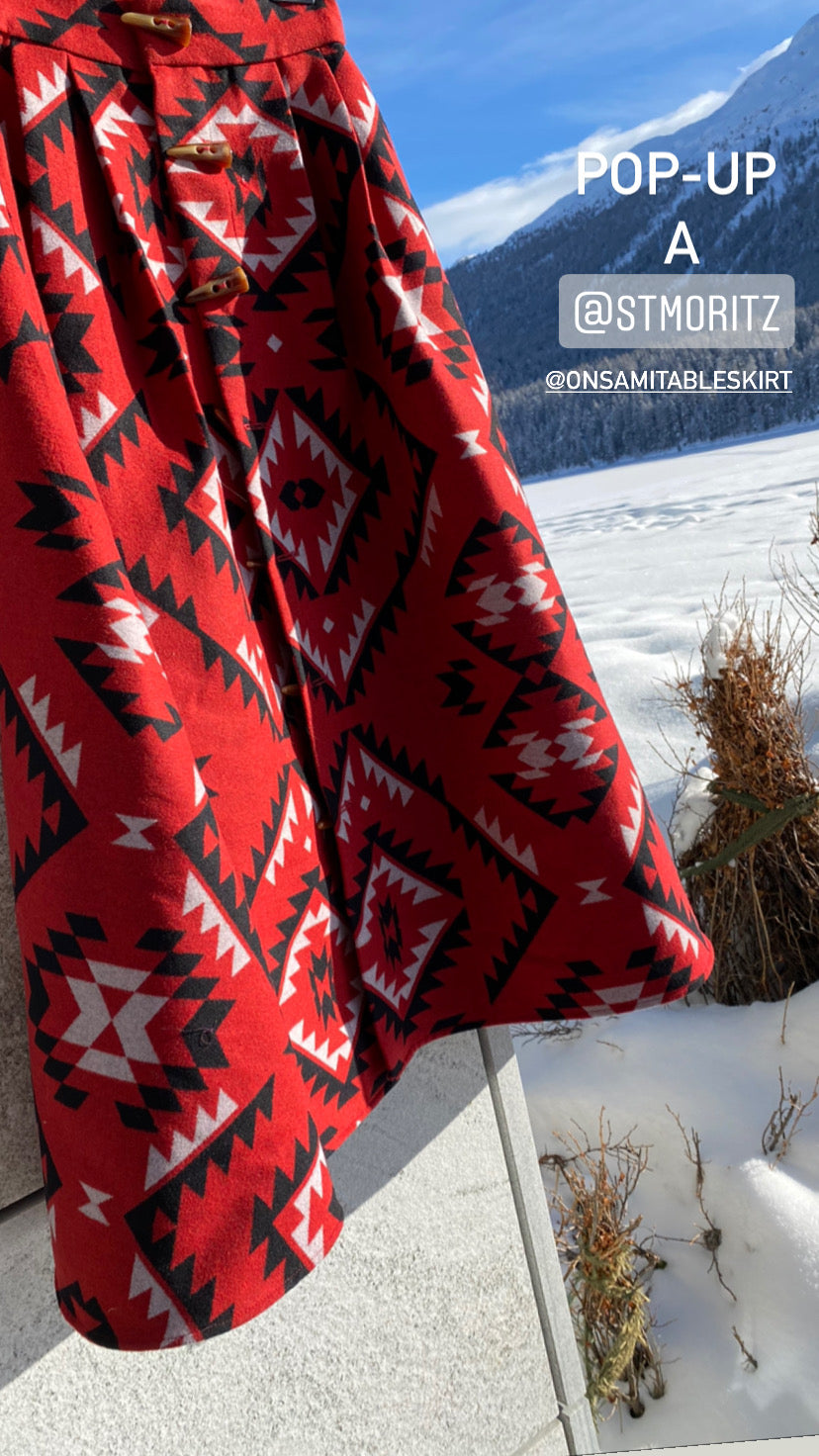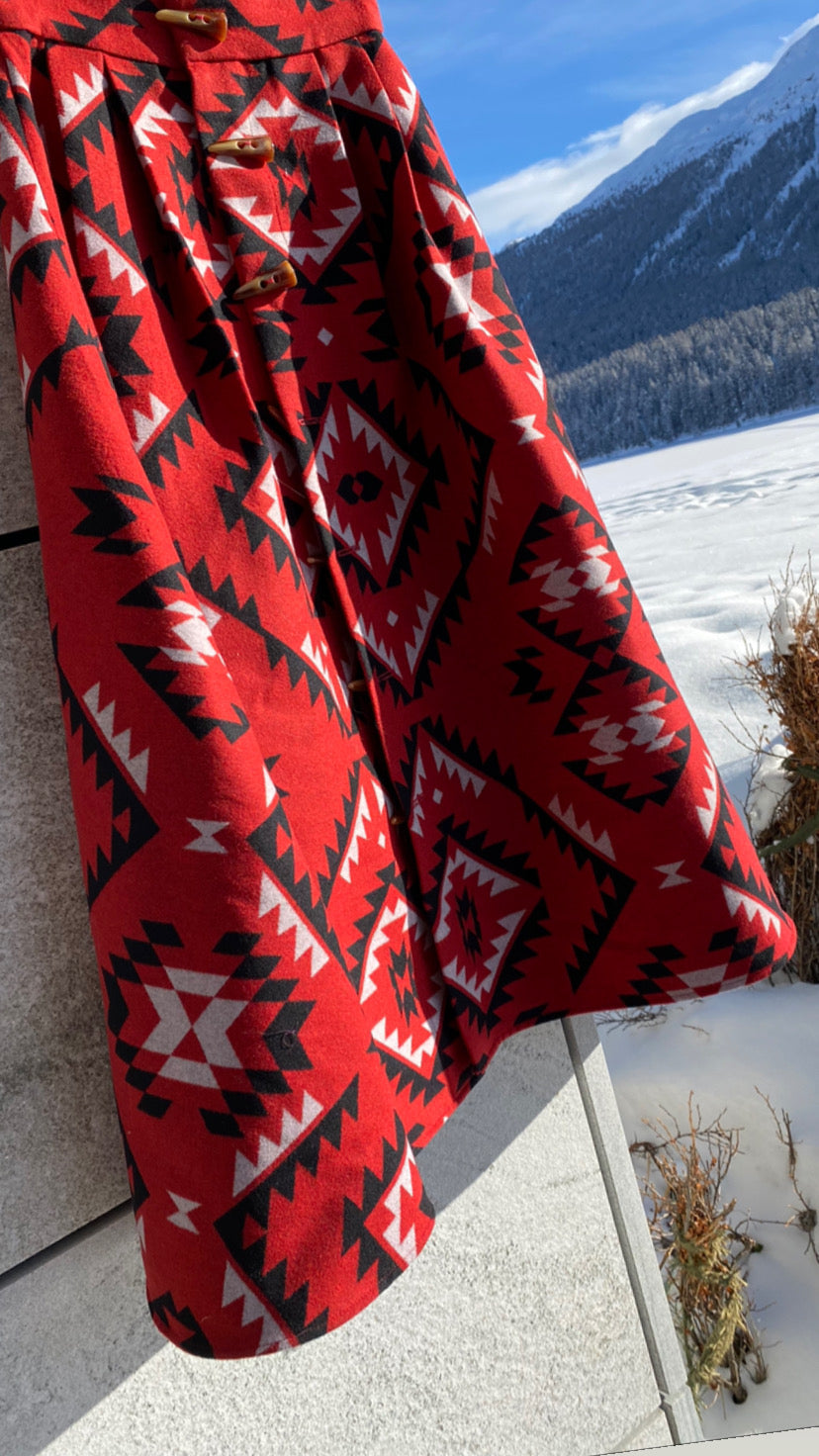 Gonna in panno in motivo Itkat con bottoni in legno colore rosso e nero. Favolosa per le giornate in montagna
