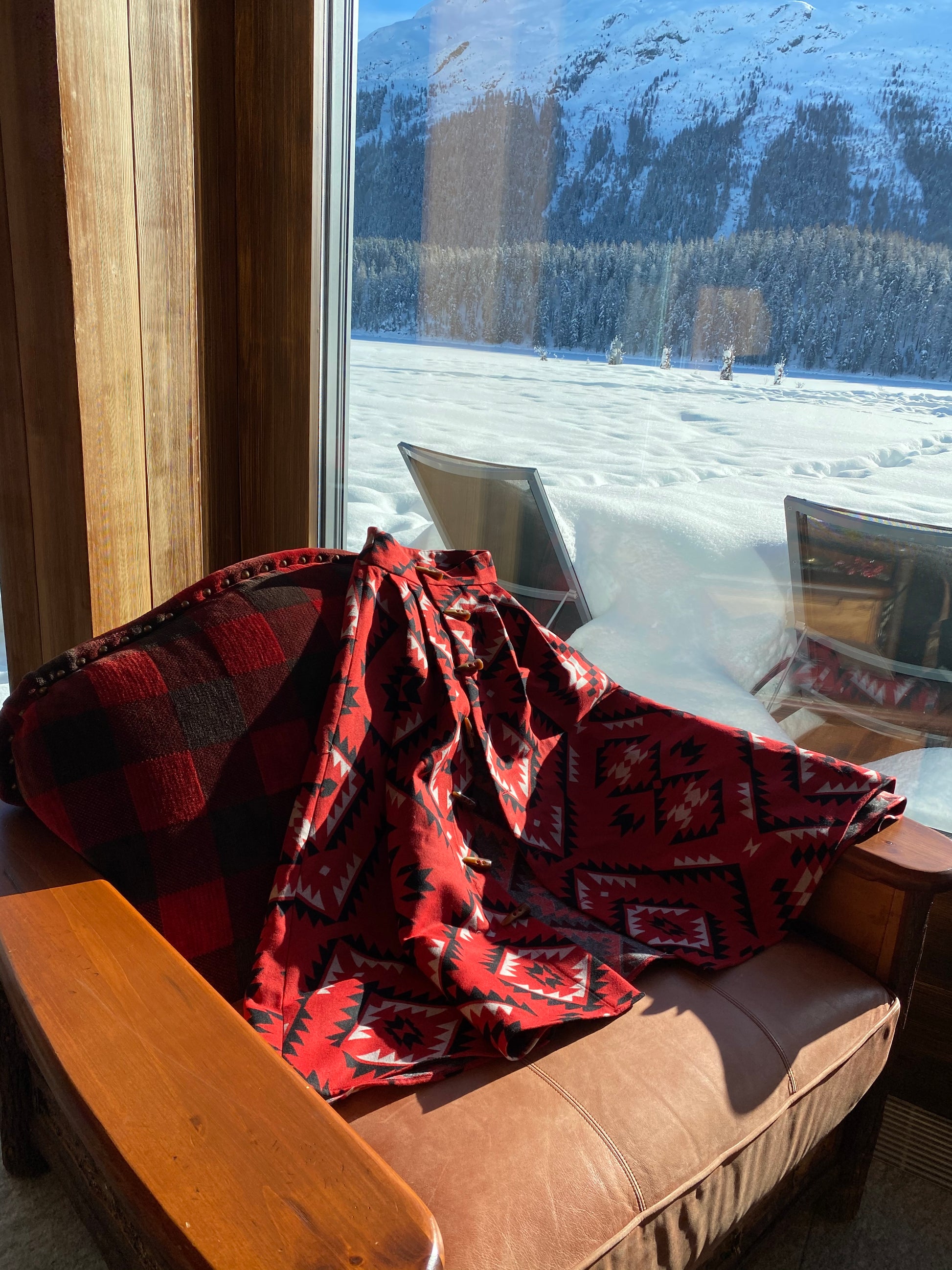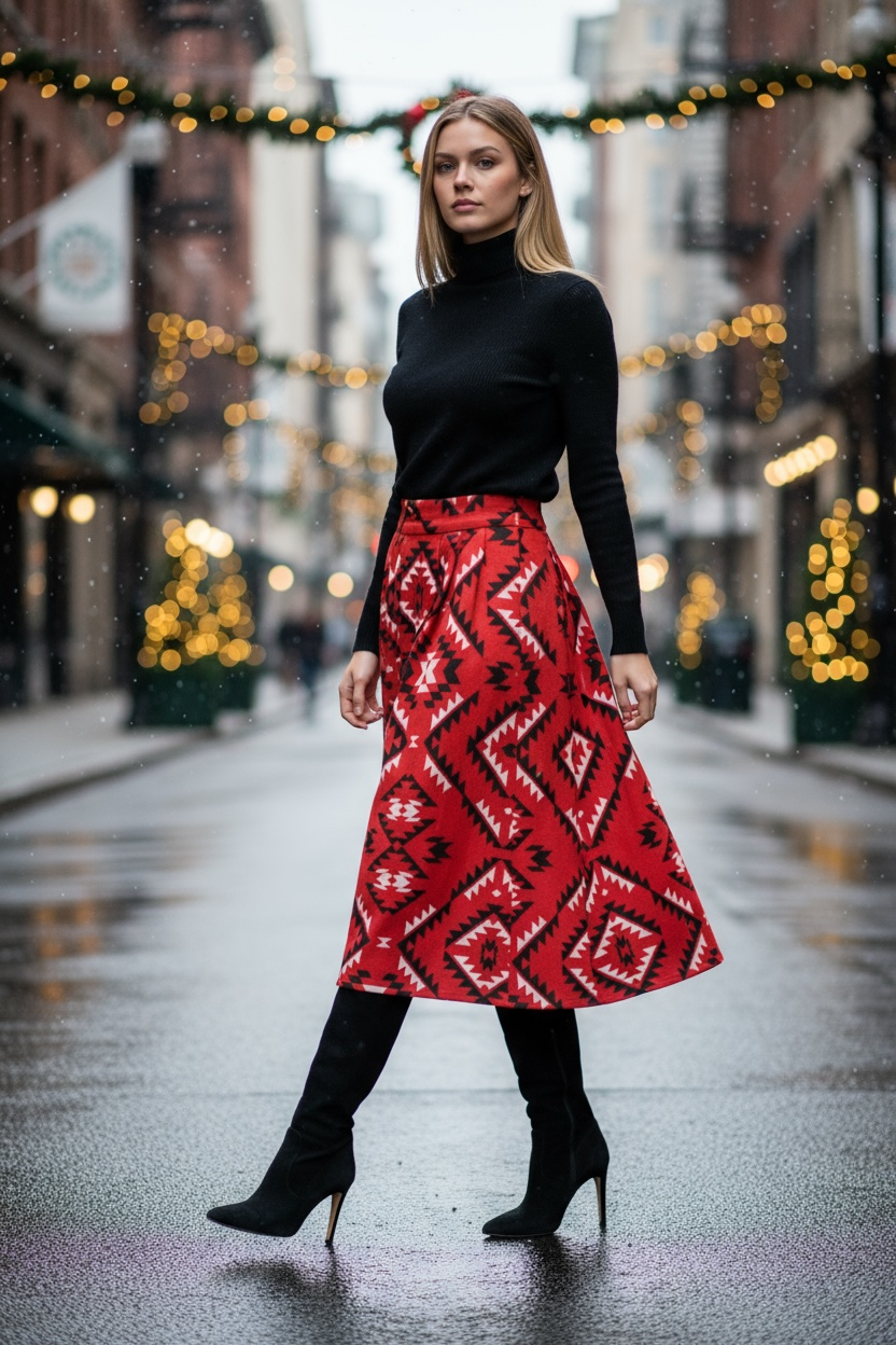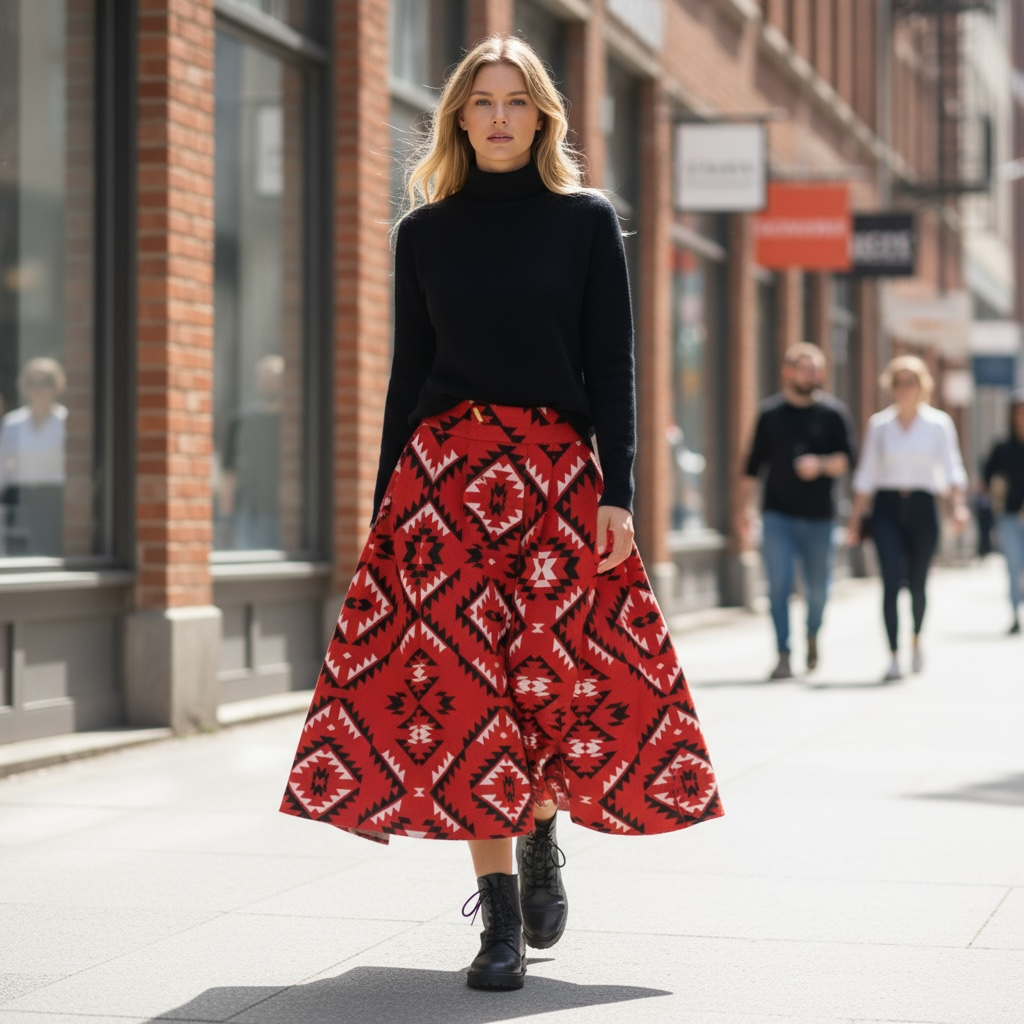 Gonna in panno in motivo Itkat con bottoni in legno colore rosso e nero. Favolosa per le giornate in montagna