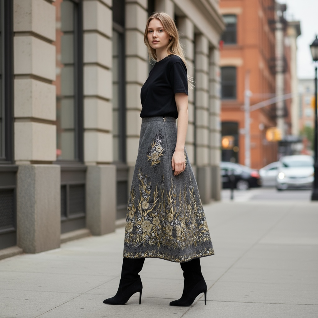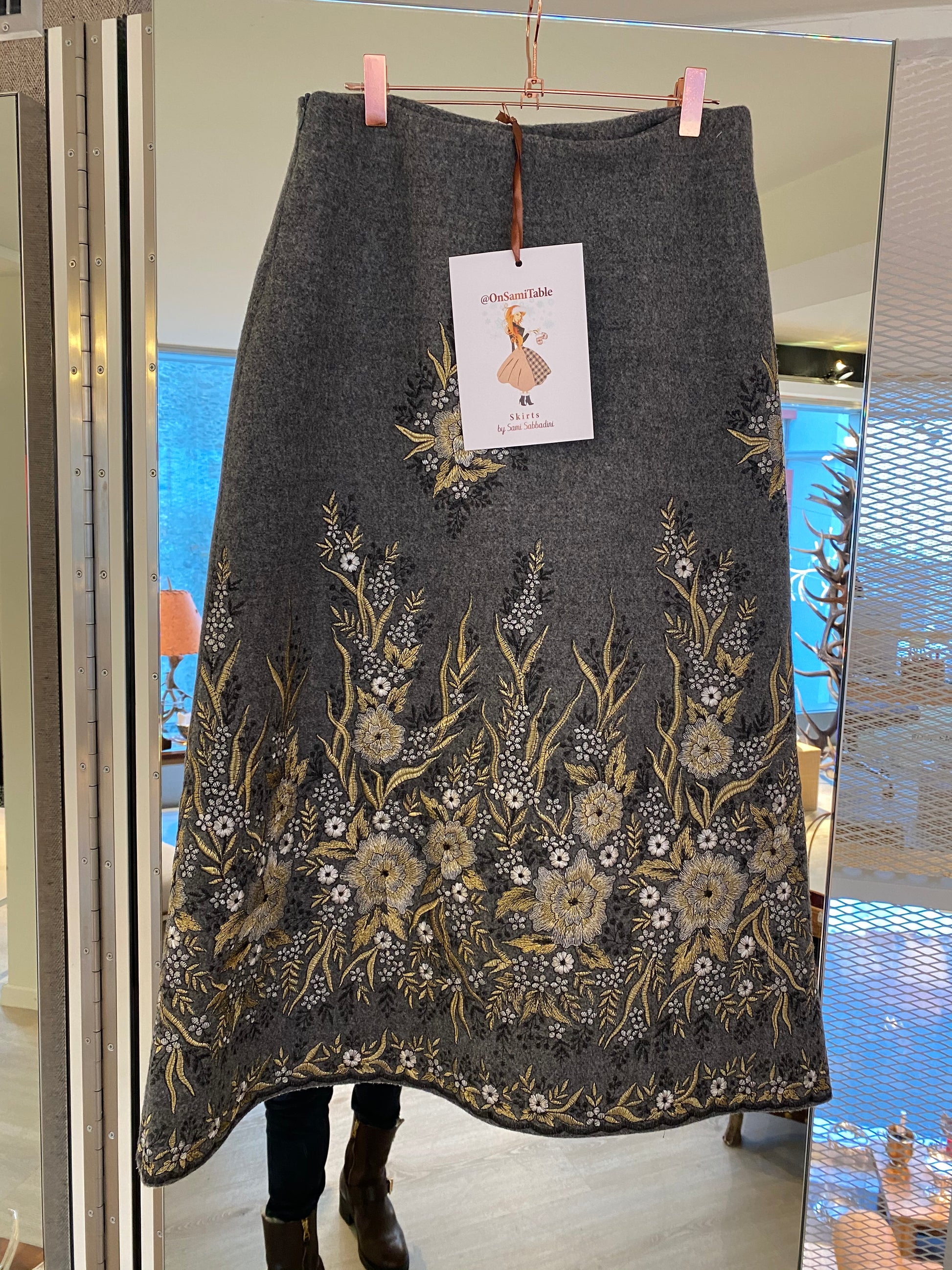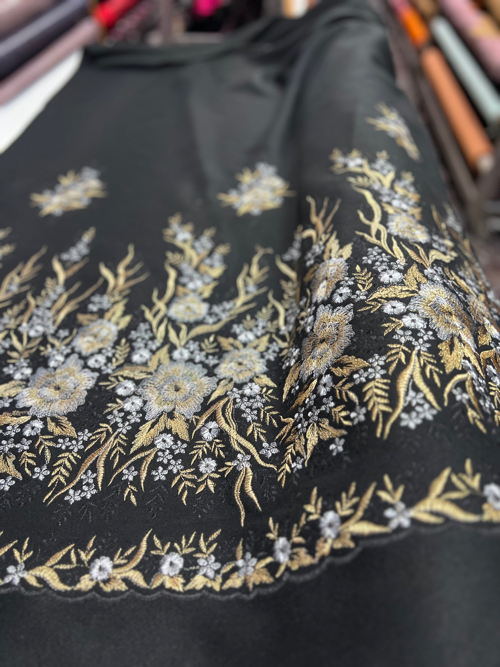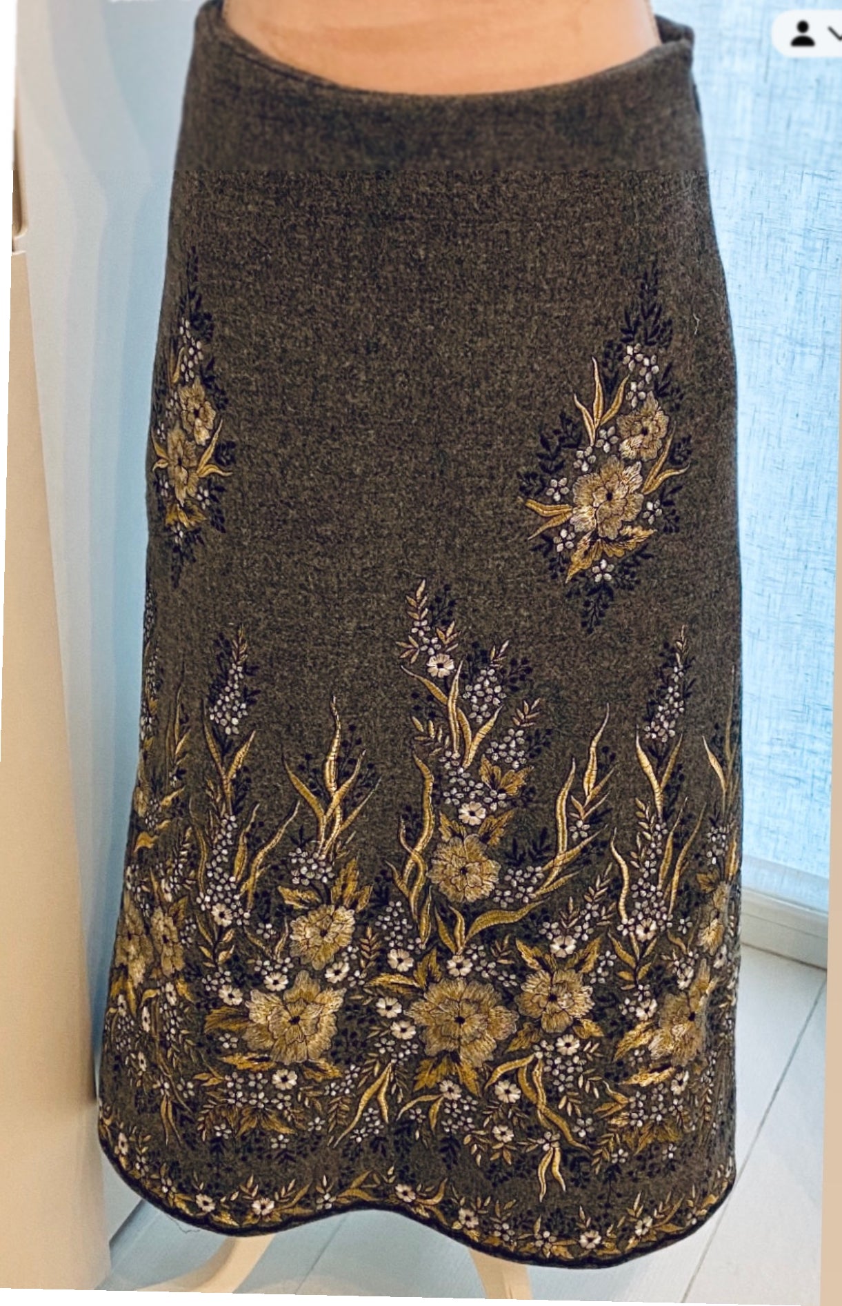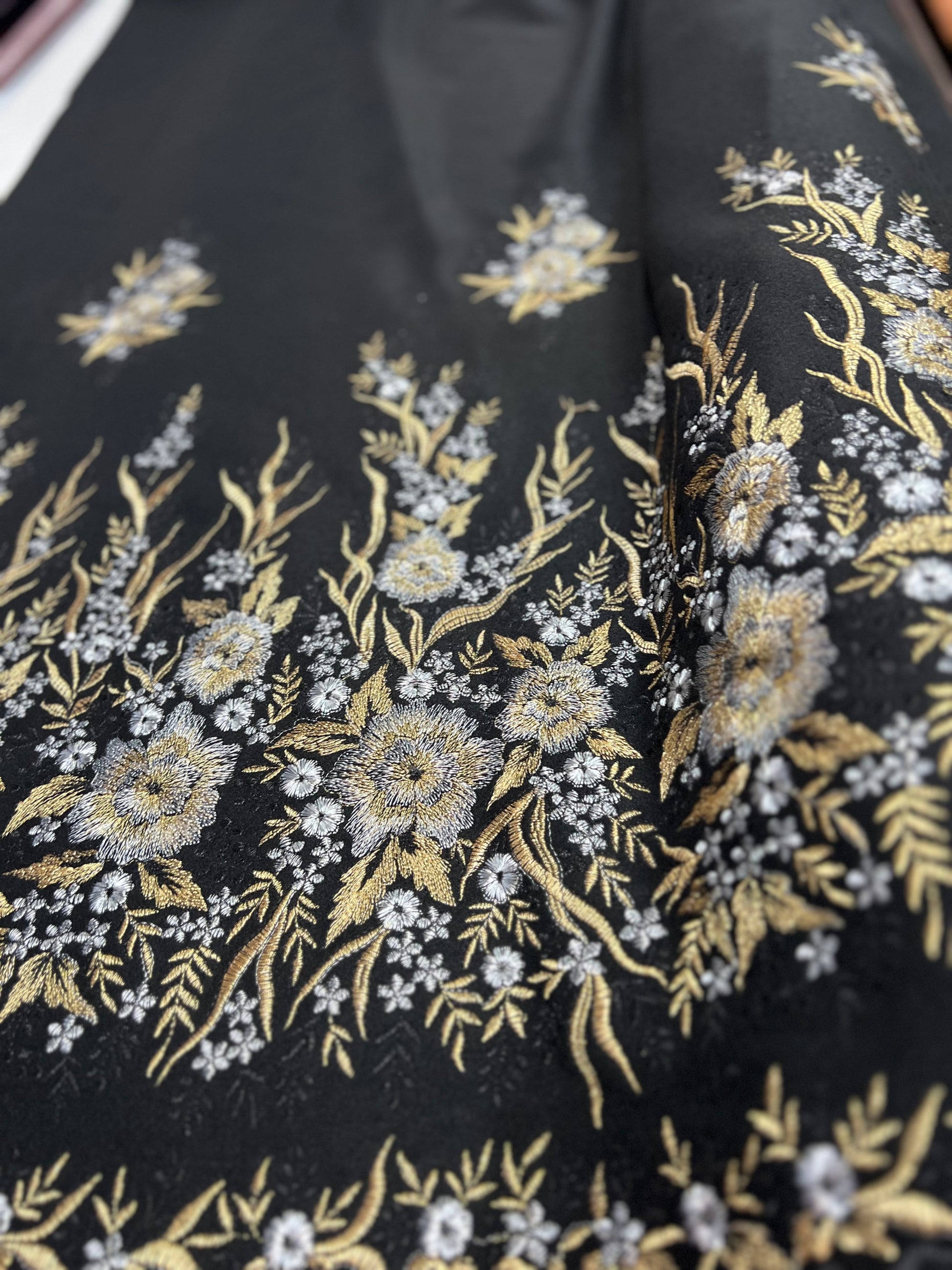 Gonna LIVIA LIMITED EDITION in un meraviglioso e prezioso tessuto di lana ricamato NERO con fiori oro e argento RICAMATI SUL FONDO.