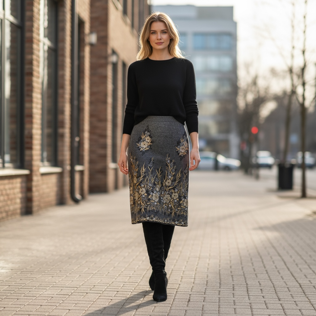 il modello Livia è un modello di gonna a sigaretta che in questo caso fa risaltare il tessuto la lunghezza può essere alla caviglia per un capo estremamente elegante per una serata importante da indossare con un top elegante e tacco alto oppure a metà polpaccio e diventa un capo molto più versatile da utilizzare anche con un anfibio o uno stivale un dolcevita. Il tessuto è nero e il ricamo oro e argento