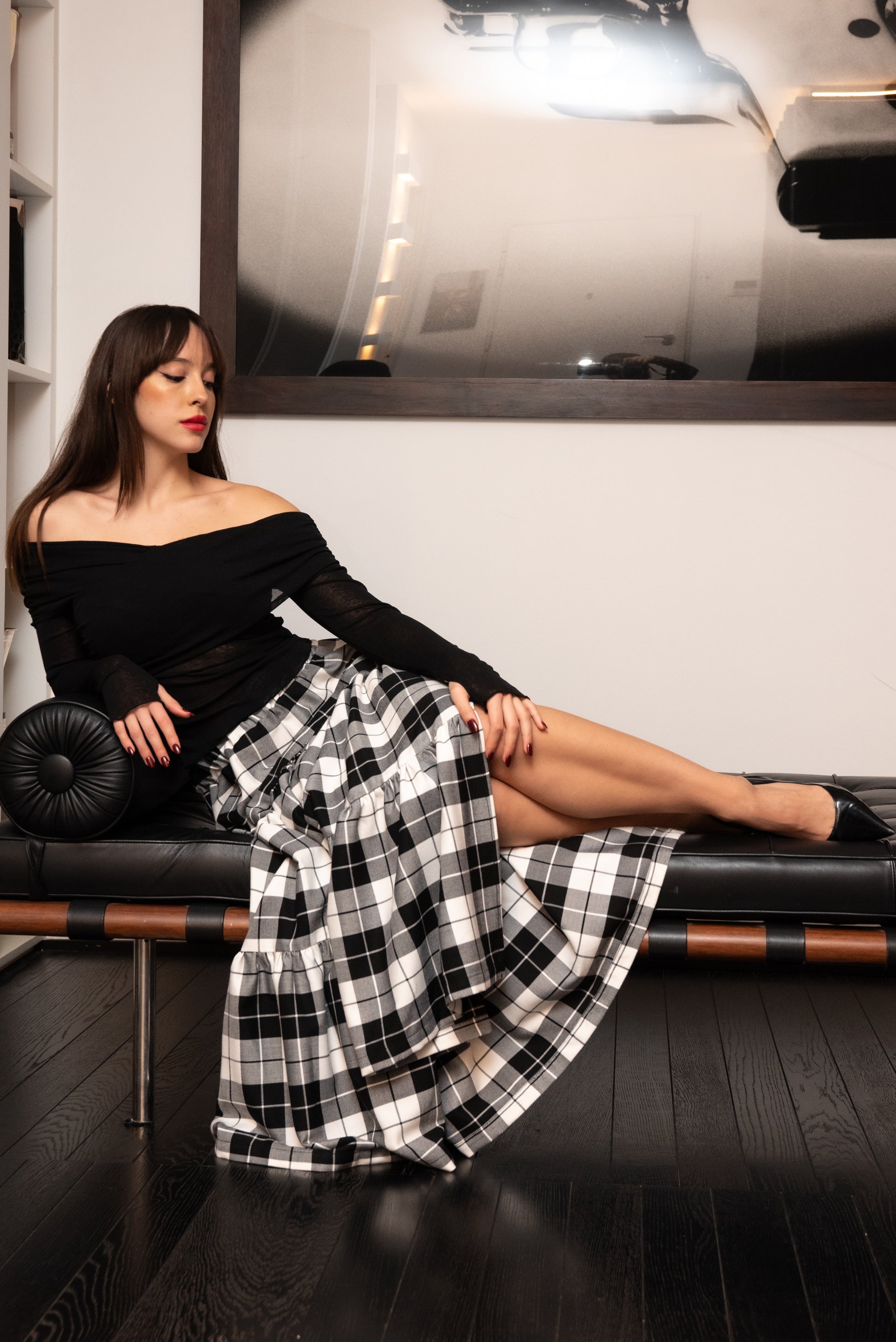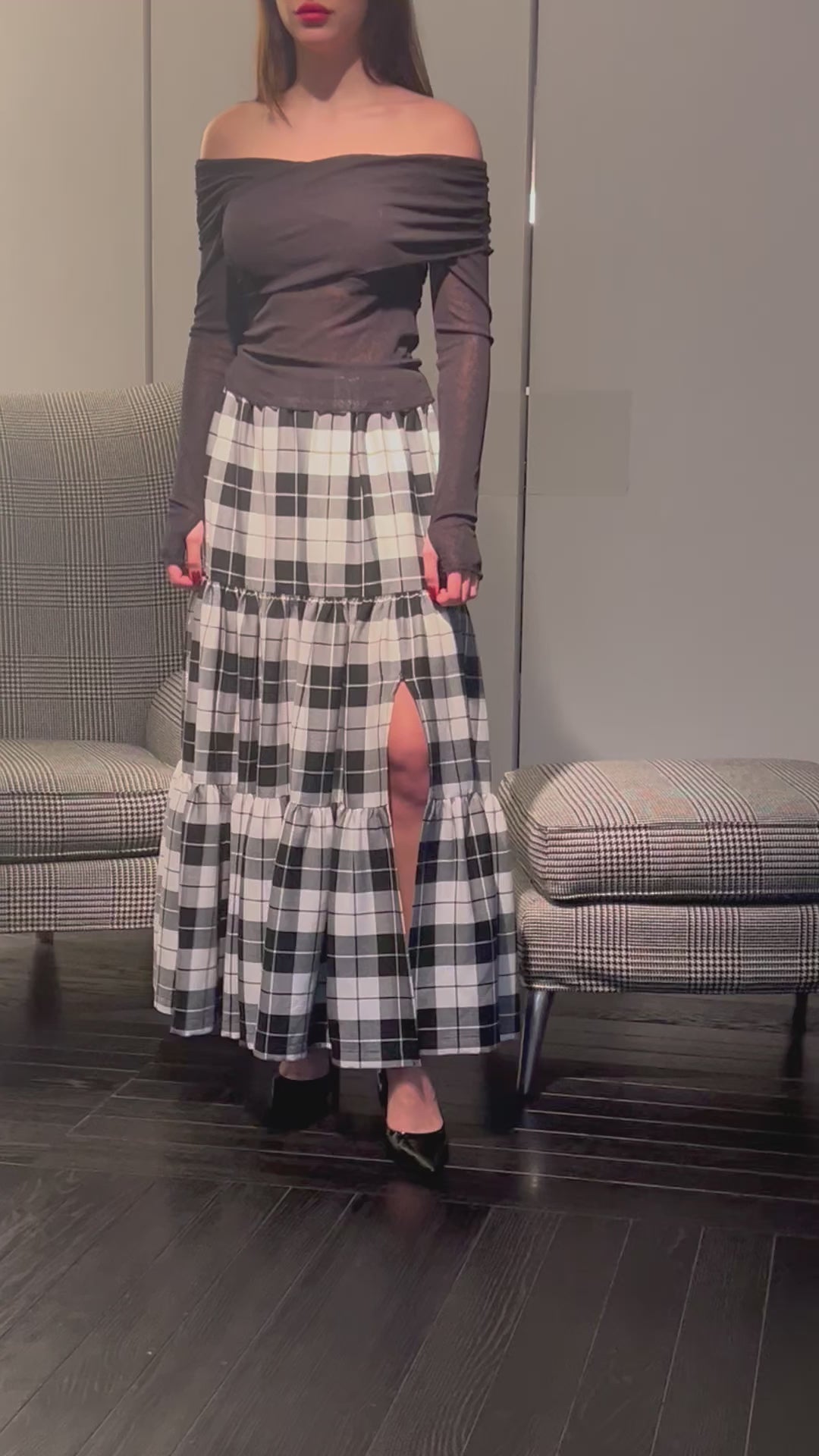 Maxi Gonna modello Franci a tre balze con elastico in vita e con profondo spacco in morbido tessuto scozzese.