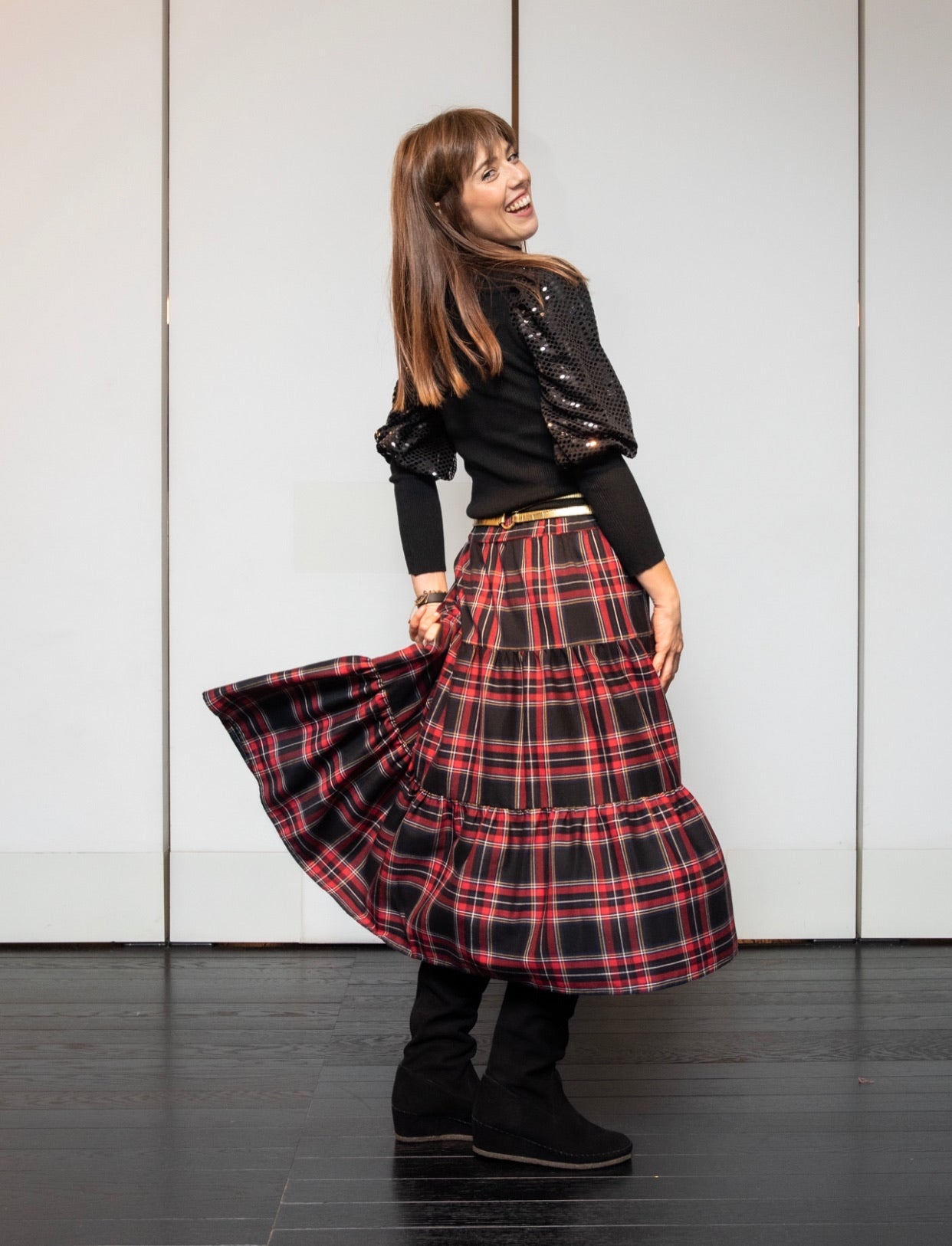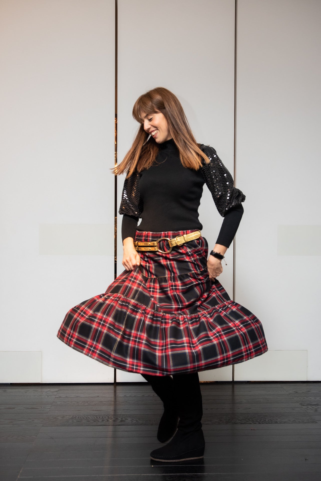 Gonna modello Franci a tre balze con elastico in vita e con profondo spacco in morbido tessuto scozzese lunghezza media