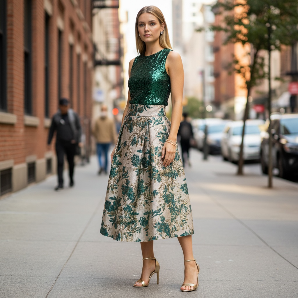 Questo tessuto in broccato scintillante, attraversato da finissimi fili brillanti, è meravigliosamente brillante Proprio la scelta giusta, se desideri cucire una meravigliosa gonna da sera super trendy per il prossimo party.