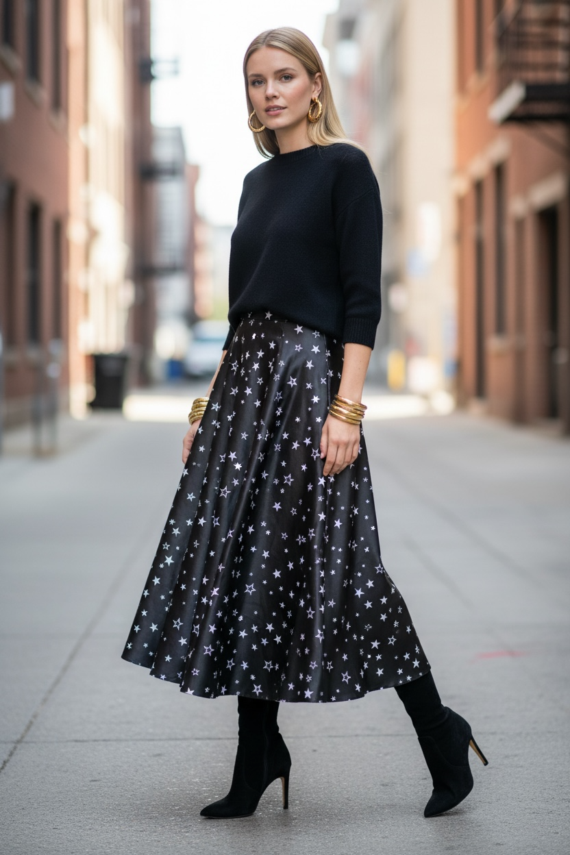 Gonna a mezza ruota dalla linea fluida e armoniosa, con elastico discreto sul retro per una vestibilità impeccabile. Realizzata in satin pregiato, dalla lucentezza profonda e setosa e dalla stampa estremamente nitida, avvolge la silhouette con naturale eleganza ed è pensata per essere un capo molto versatile utilizzabile dal giorno alla sera.
