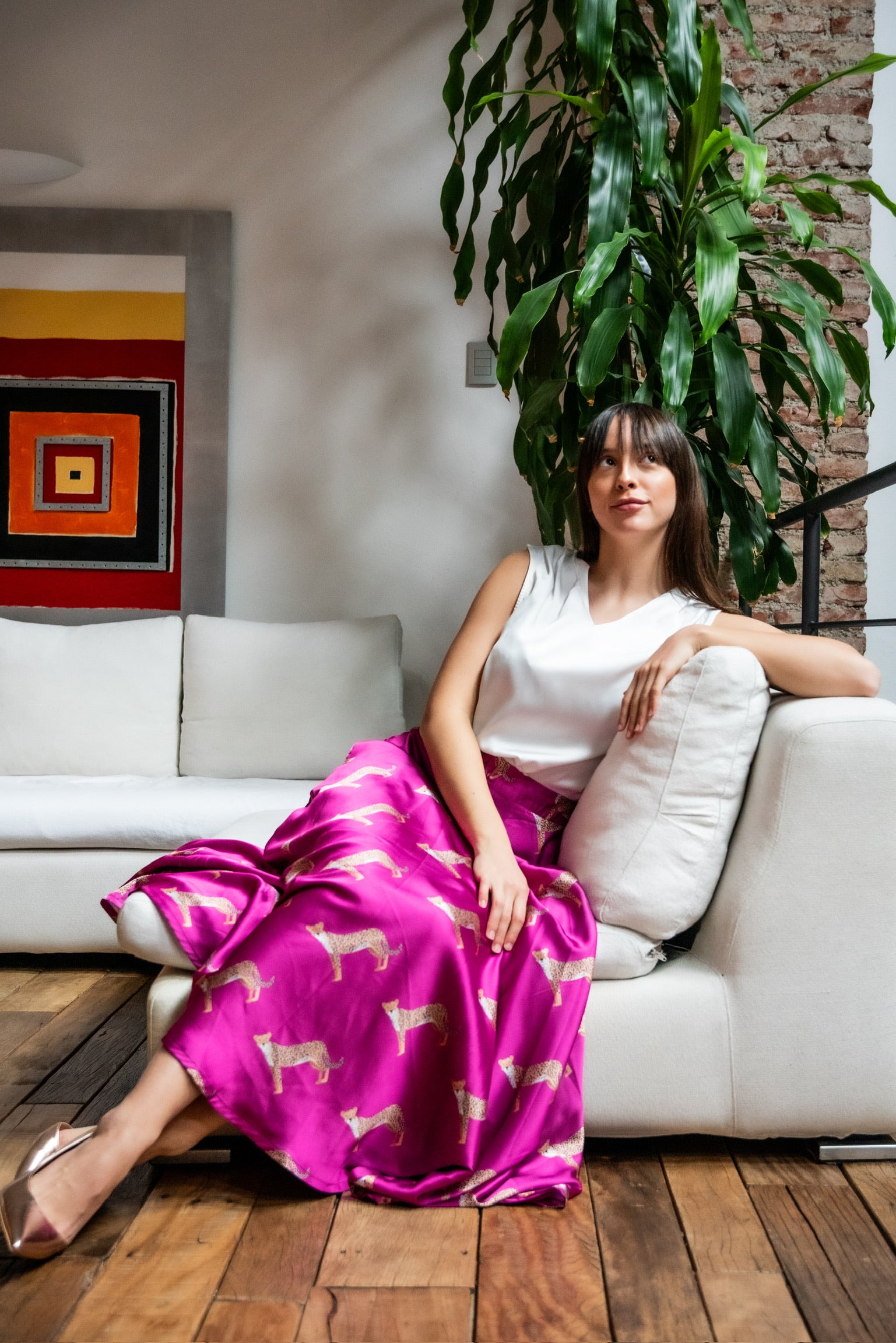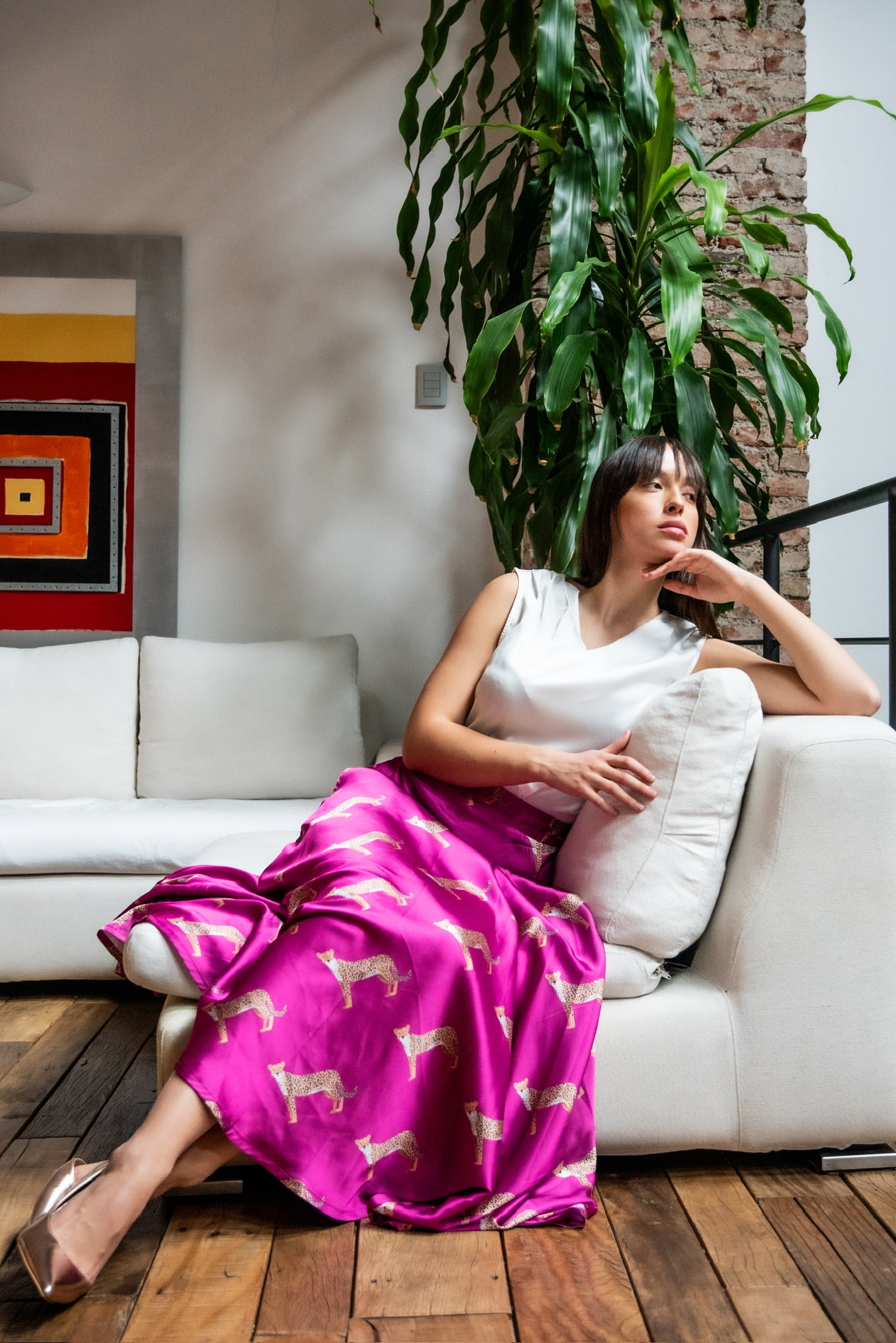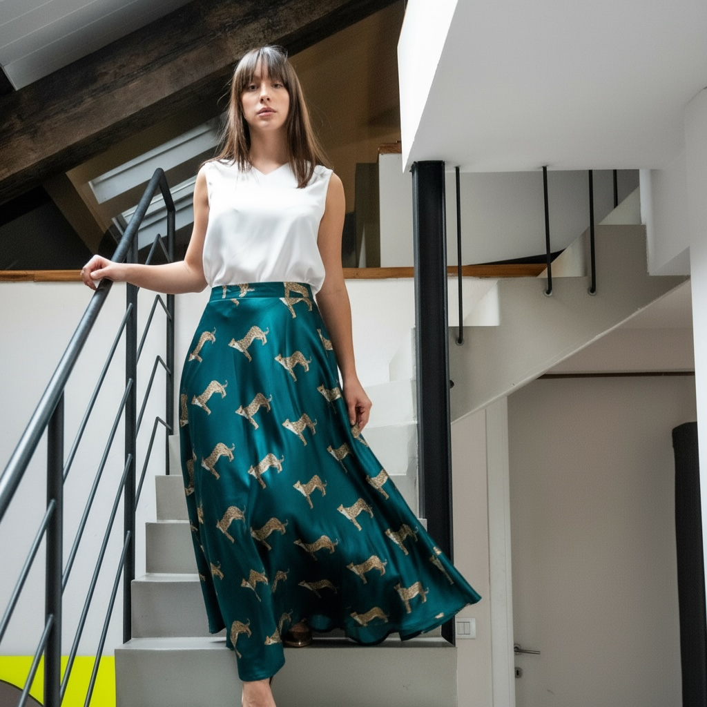 Gonna lunga modello Malu’ a mezza ruota in tessuto di satin morbido con tasche sui fianchi