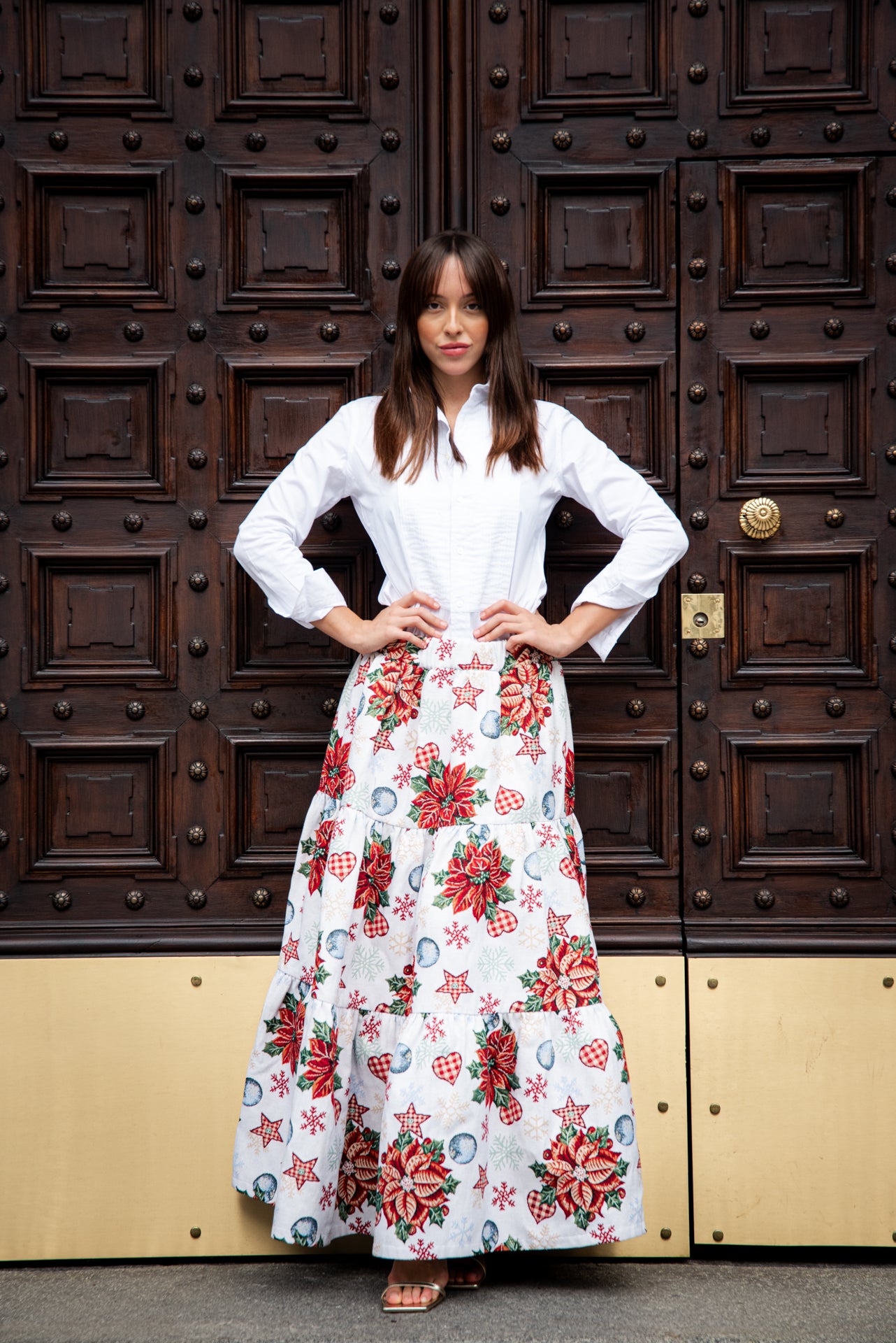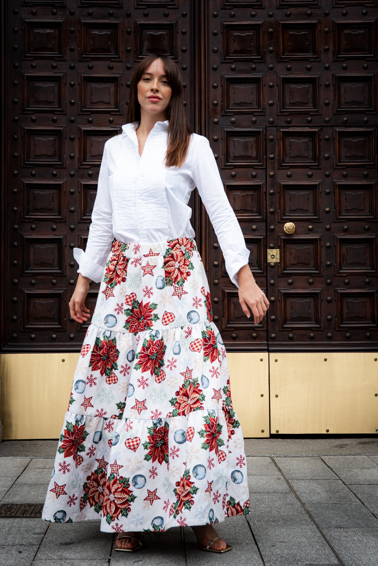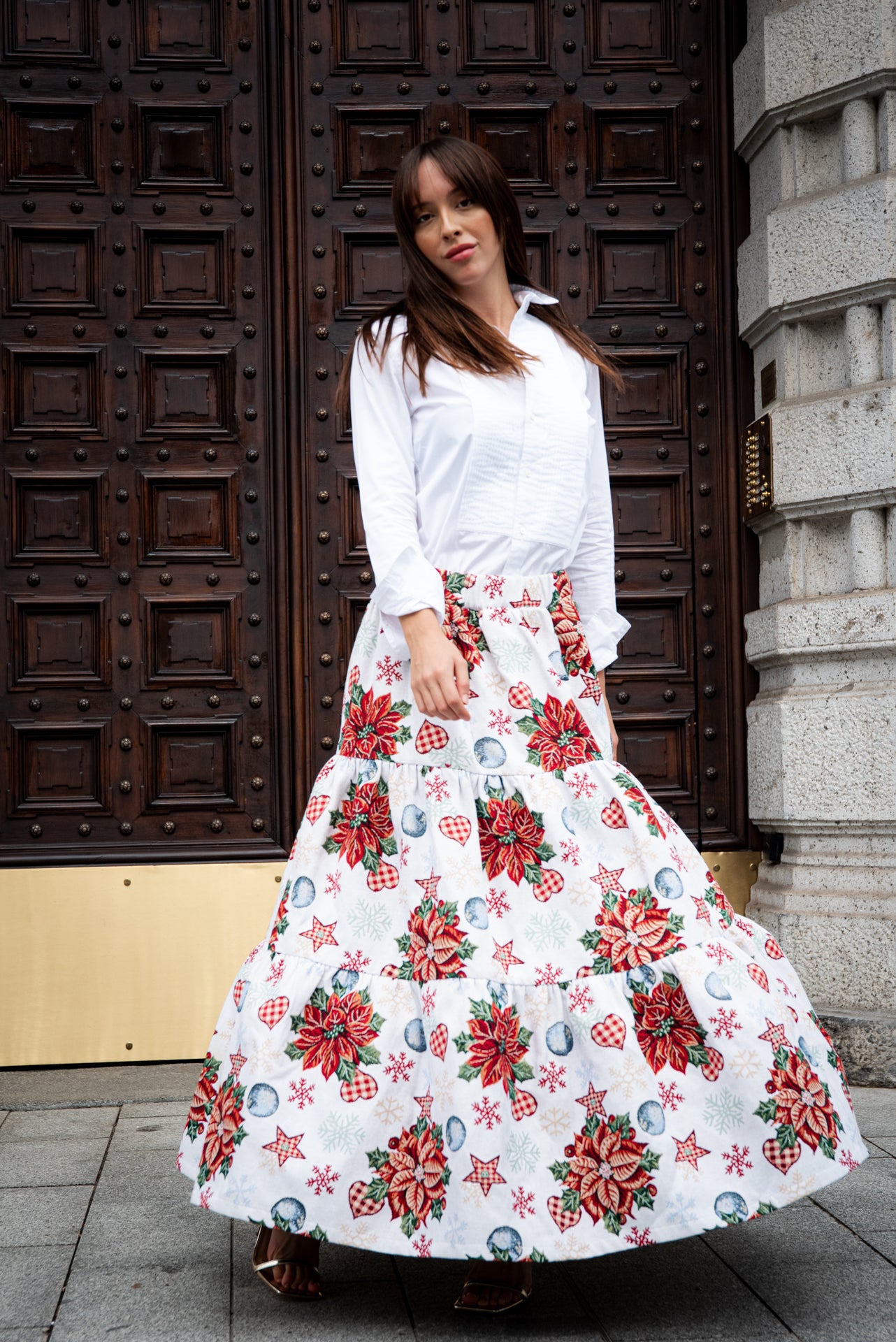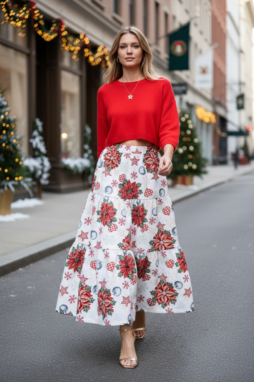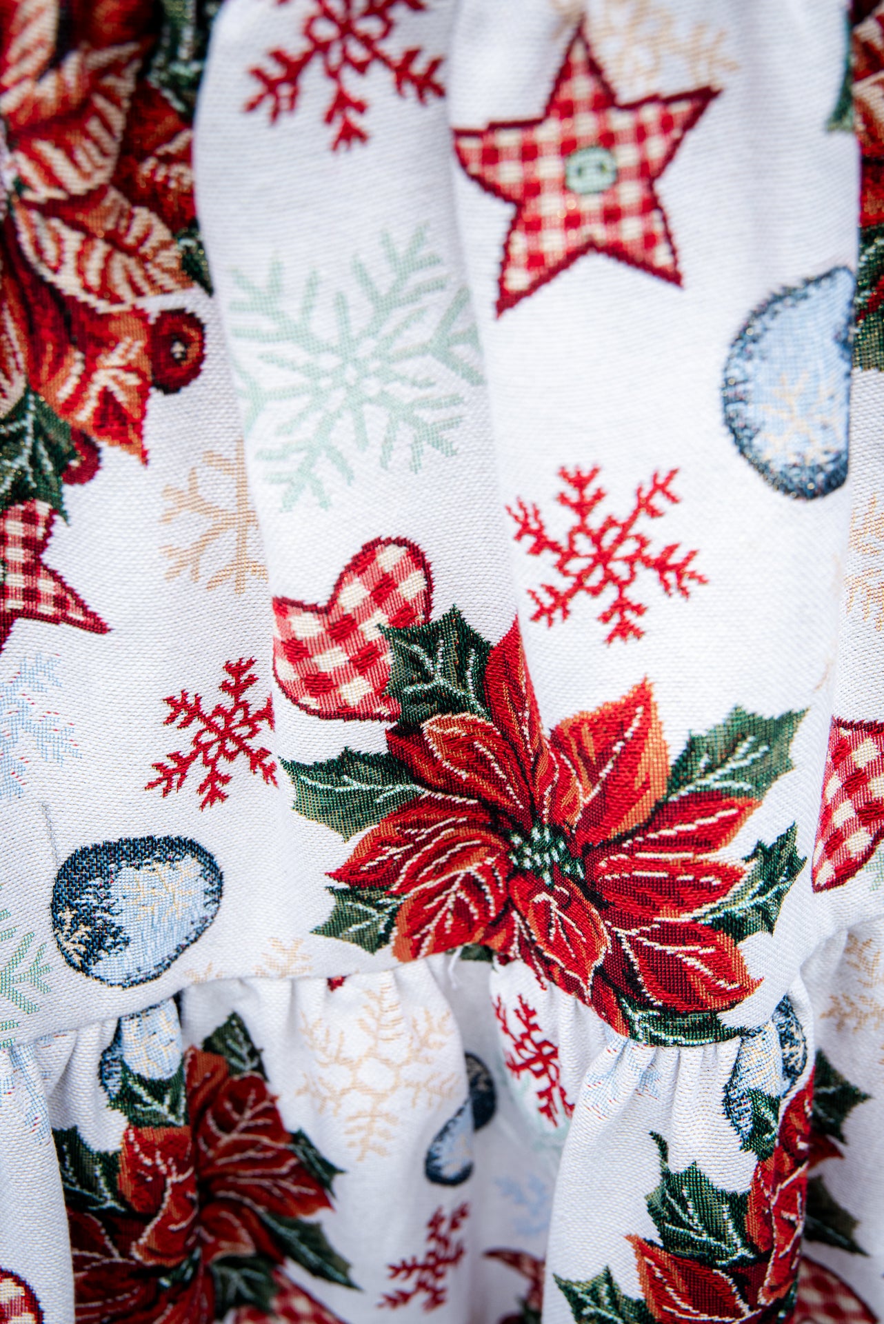 Gonna natalizia realizzata in tessuto duchesse con stampa di stelle di Natale, decori festivi e colori brillanti. Il duchesse ha una mano compatta e una caduta pulita, perfetta per dare volume e movimento senza appesantire.