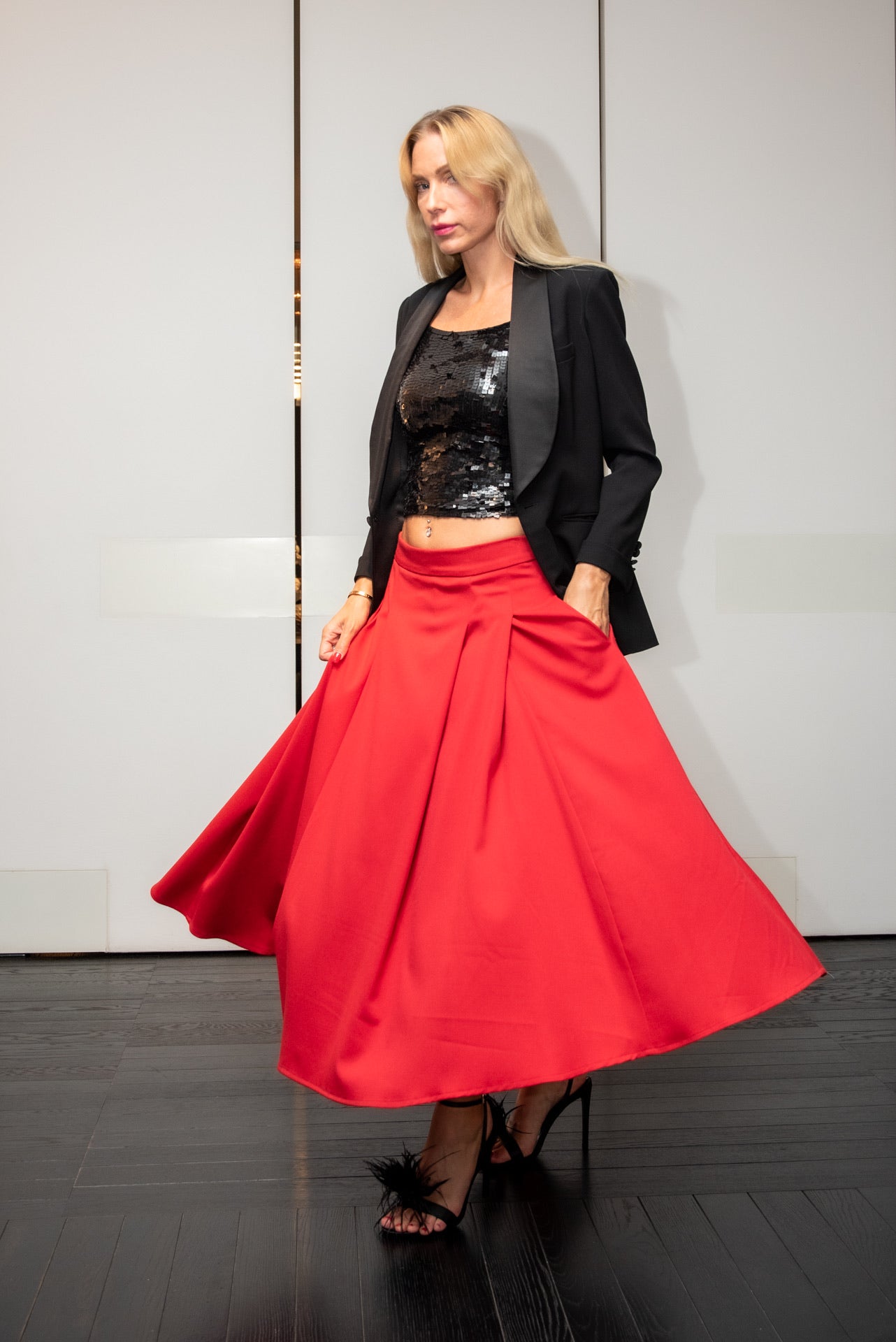 Gonna modello Luisa e’ una gonna in lana rossa con pieghe e spacco laterale. Disponibile in altre varianti di colore in tinta unita. Per maggiori info sui colori disponibili wup al +393470657811