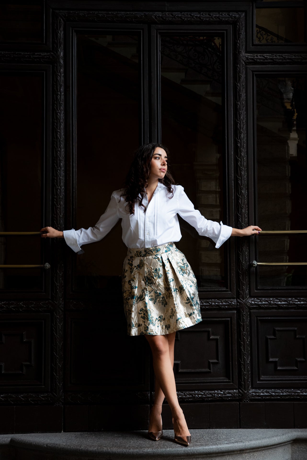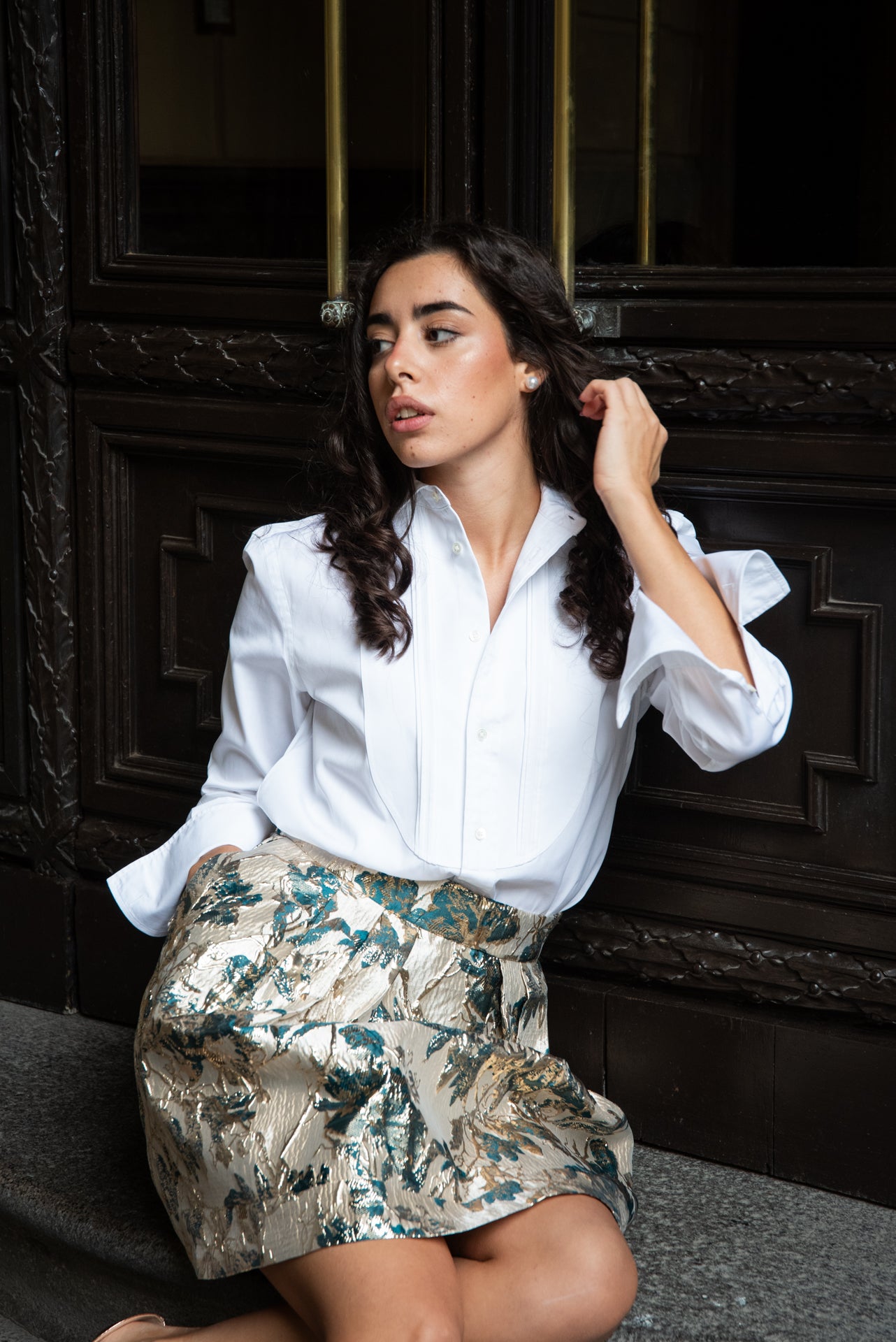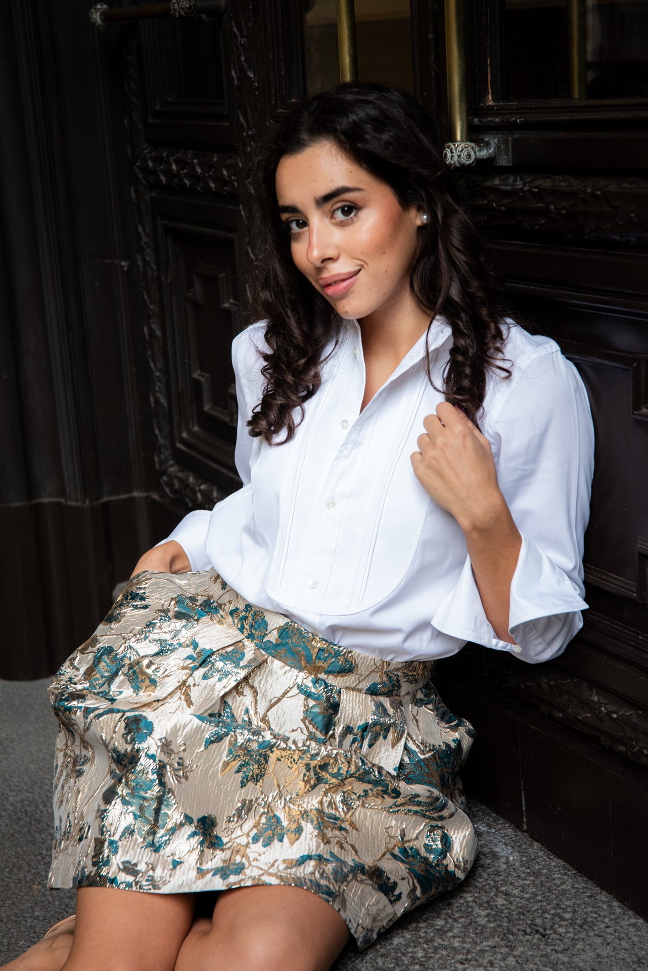 Gonna corta in broccato oro e verde bosco modello con pieghe sul davanti, elastico in vita sul retro e tasche