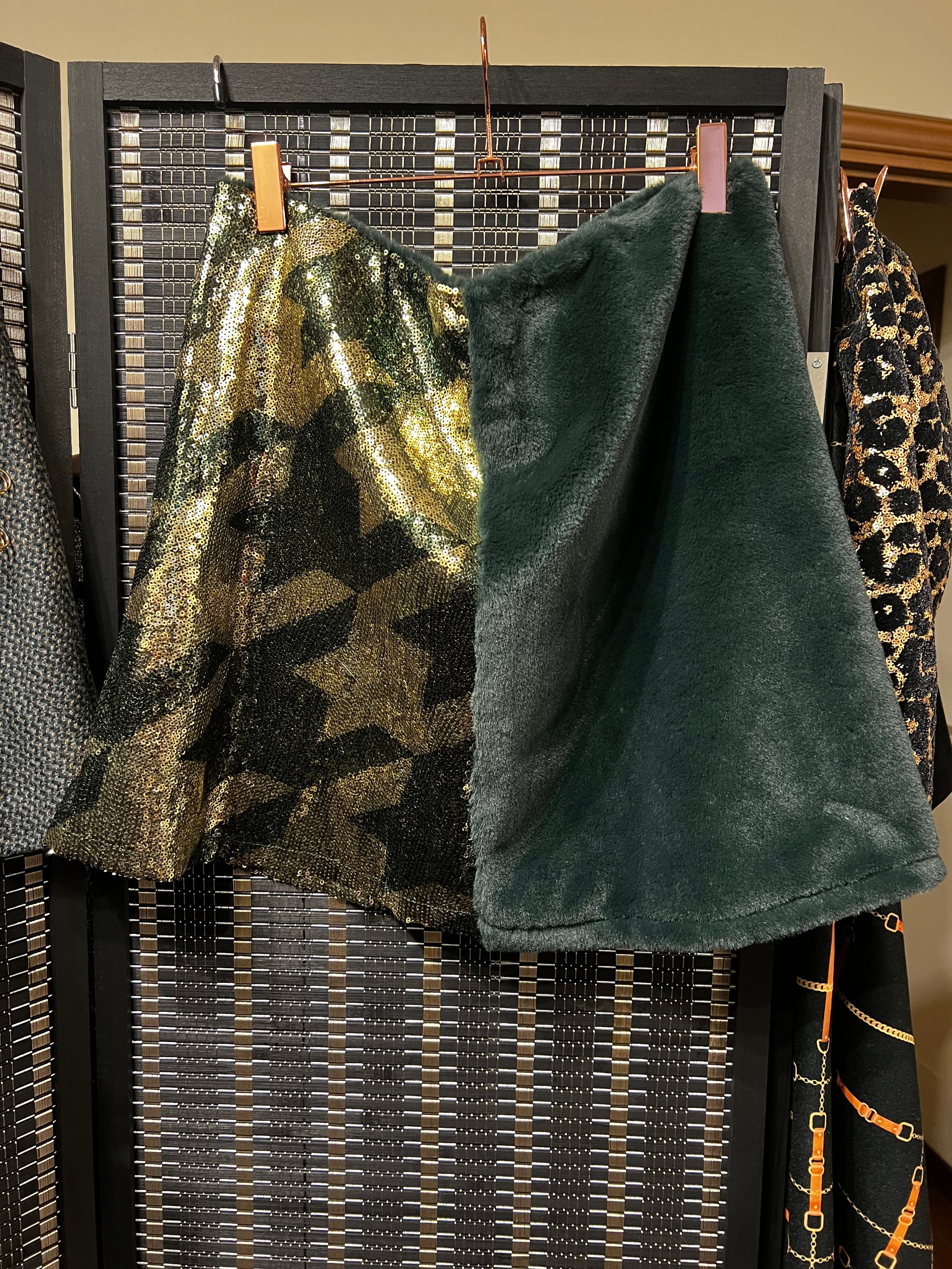 L’altro in paillettes pied-de-poule oro e verde, luminose e sofisticate.