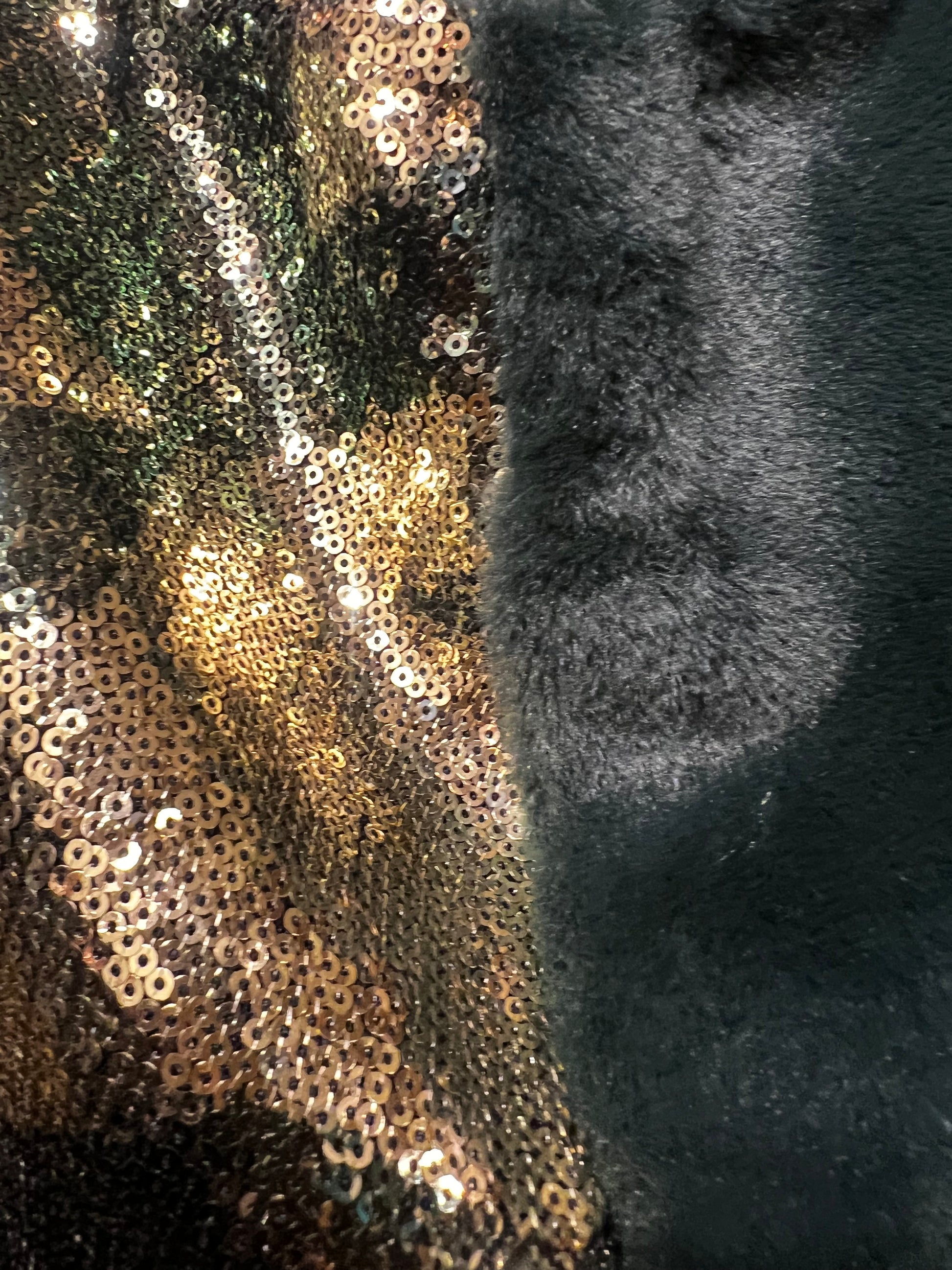 Un lato in eco-pelliccia verde bottiglia, morbida e ricca.