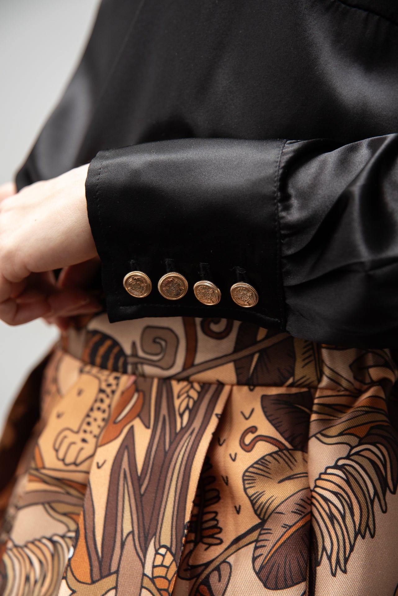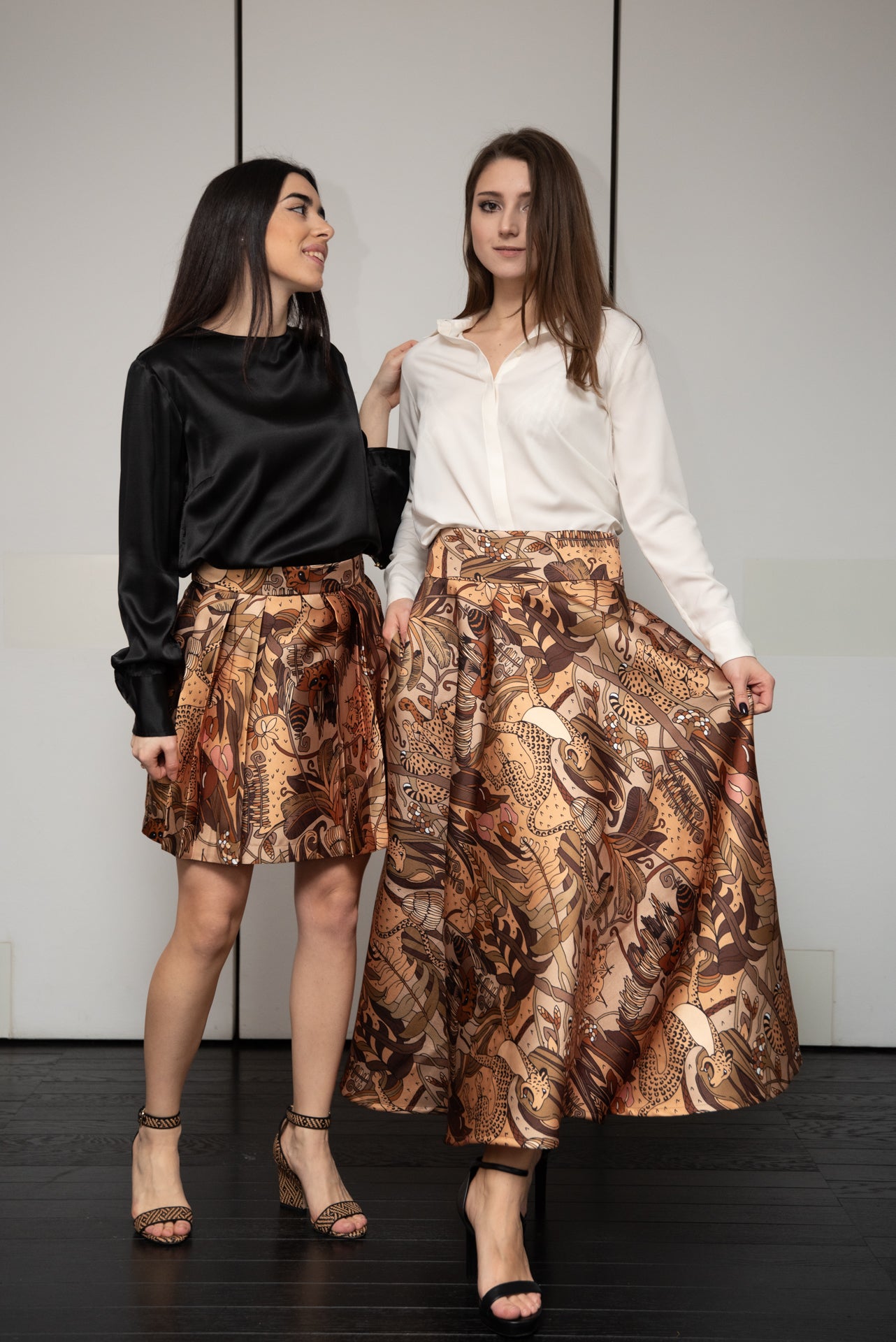 Gonna Modello Paola in tessuto panno con disegno SAVANA con tasche laterali e pieghe sul davanti con elastico in vita.