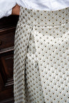 la Gonna Robi si abbina facilmente a bluse in seta o camicie bianche, creando un outfit impeccabile per occasioni speciali. Le pieghe donano movimento e leggerezza, mentre il broccato di colore salvia aggiunge un tocco di classe e originalità.