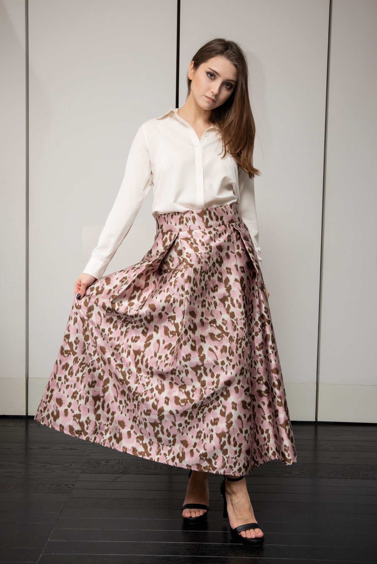 la Gonna Robi si abbina facilmente a bluse in seta o camicie bianche, creando un outfit impeccabile per occasioni speciali. Le pieghe donano movimento e leggerezza, mentre il broccato di colore rosa aggiunge un tocco di classe e originalità.