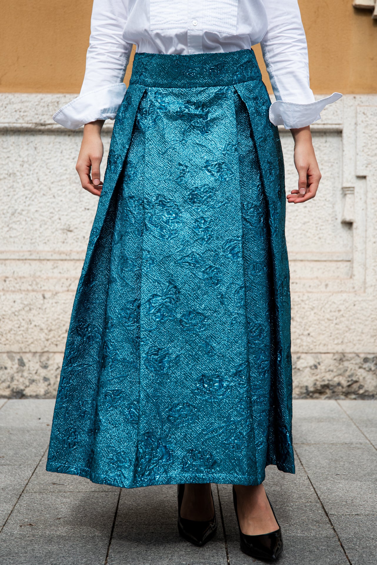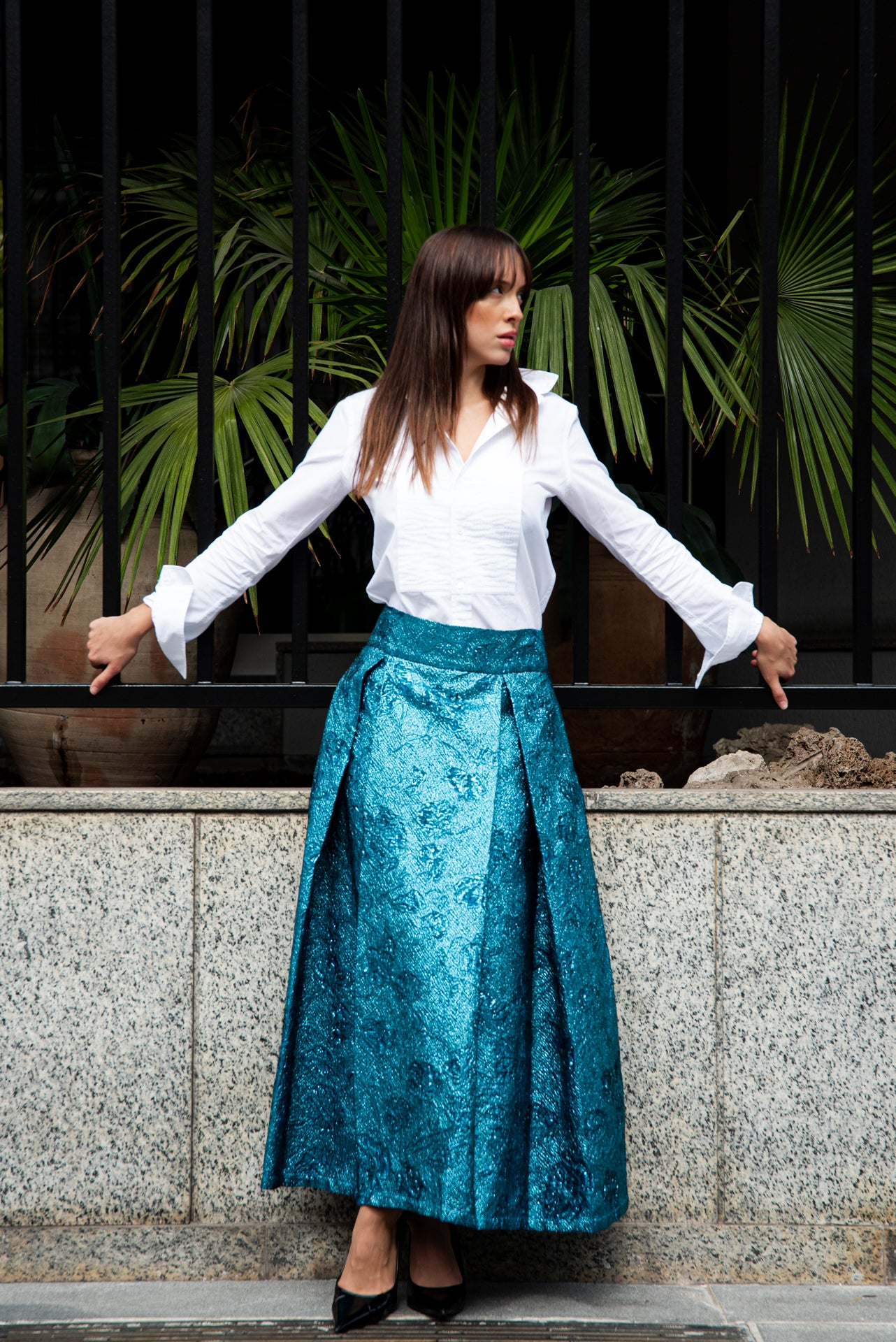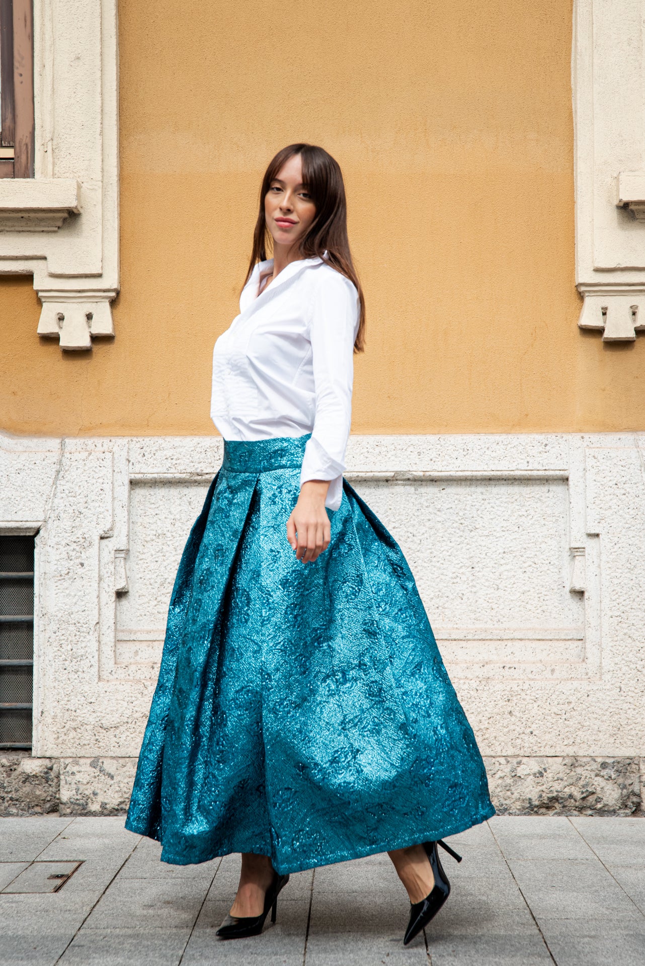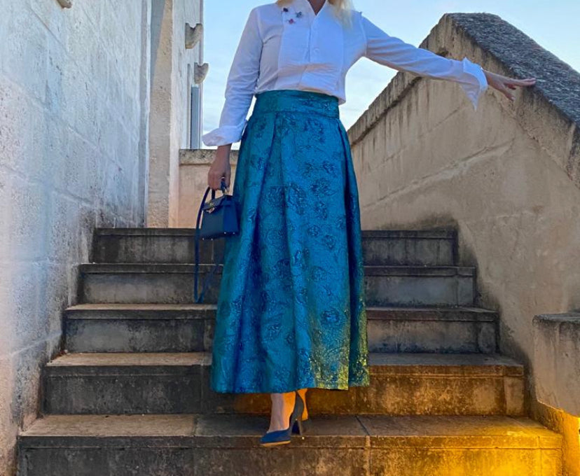la Gonna Robi si abbina facilmente a bluse in seta o camicie bianche, creando un outfit impeccabile per occasioni speciali. Le pieghe donano movimento e leggerezza, mentre il broccato di colore salvia aggiunge un tocco di classe e originalità.