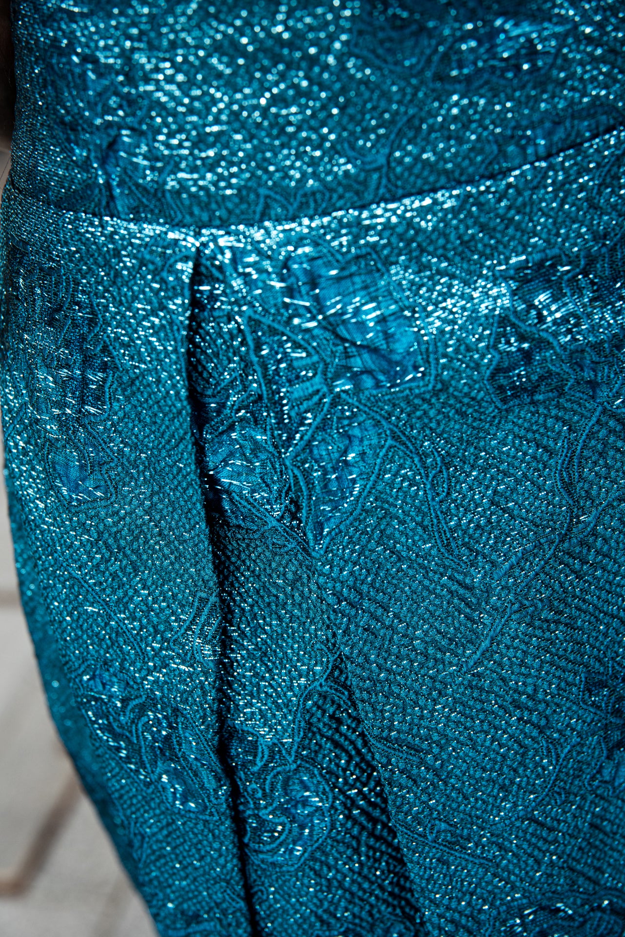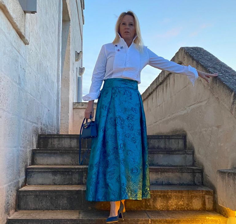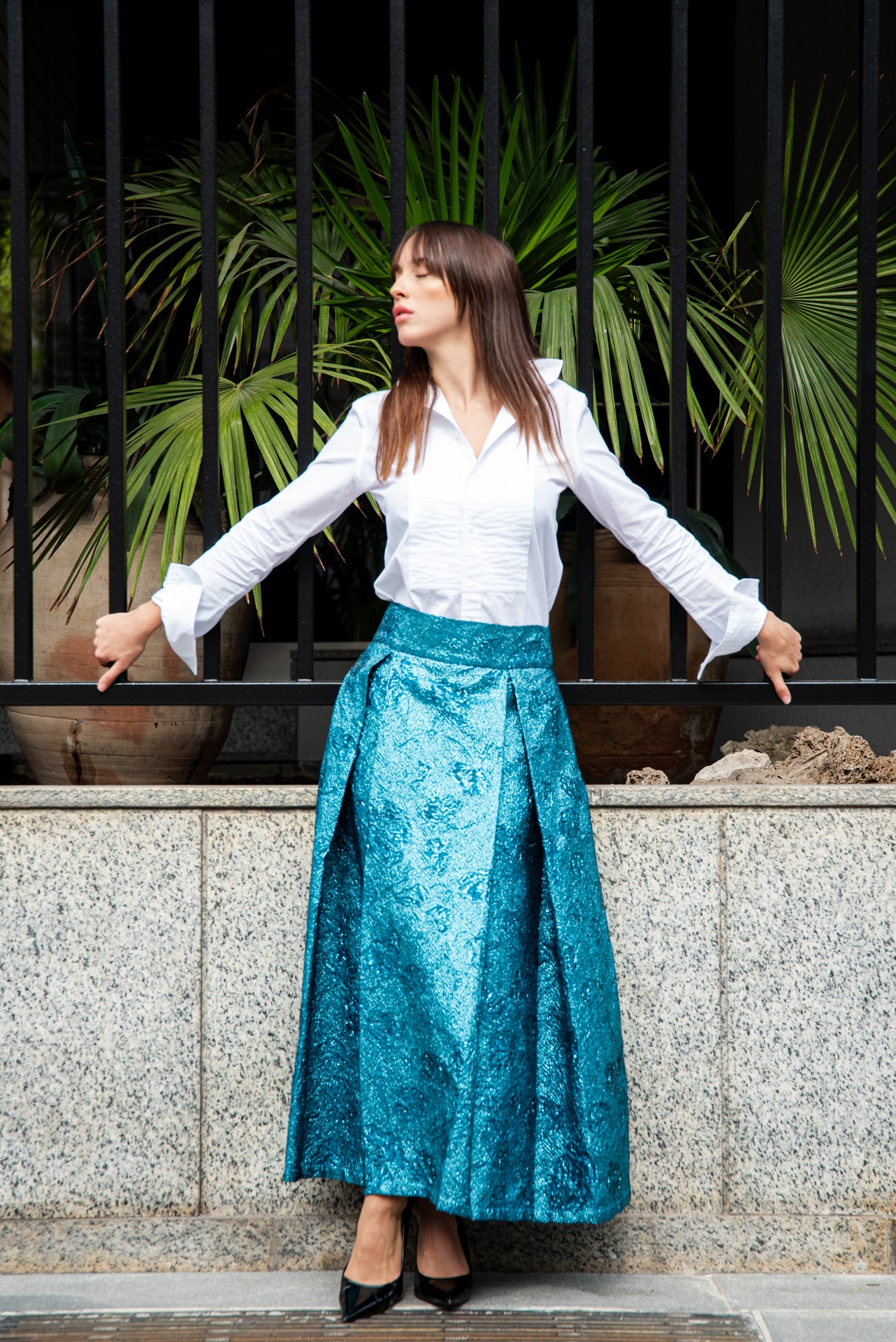 la Gonna Robi si abbina facilmente a bluse in seta o camicie bianche, creando un outfit impeccabile per occasioni speciali. Le pieghe donano movimento e leggerezza, mentre il broccato di colore salvia aggiunge un tocco di classe e originalità.