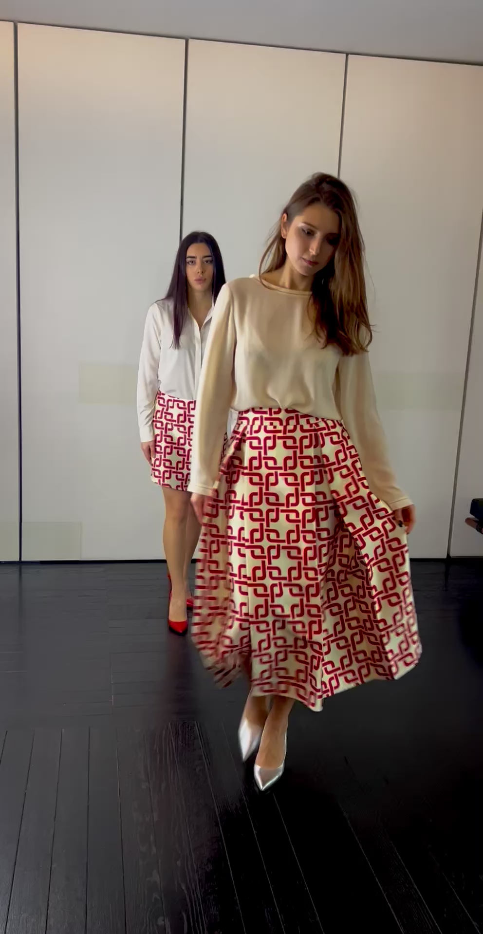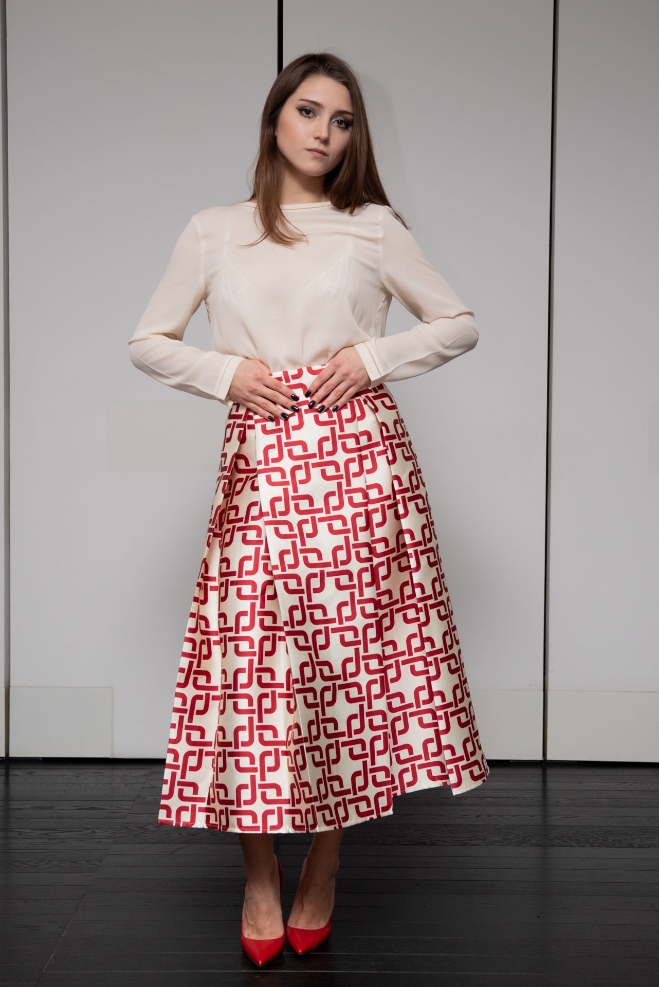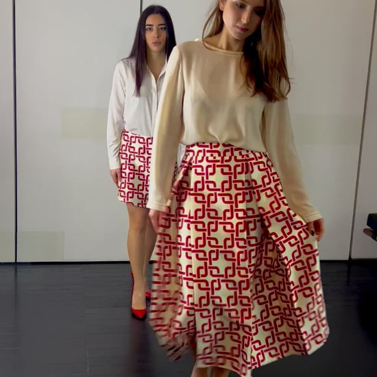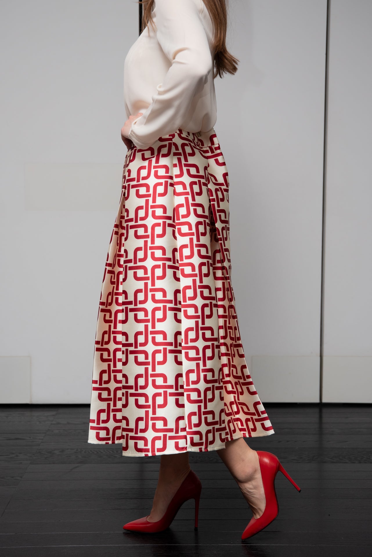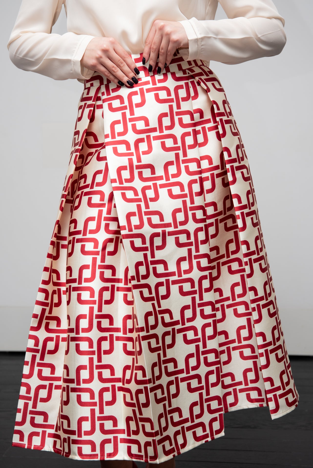 Gonna Modello Robi in tessuto mikado con disegno geometrico con tasche laterali e pieghe sul davanti questa gonna e’ confezionata su misura quindi la consegna è in 10 giorni lavorativi