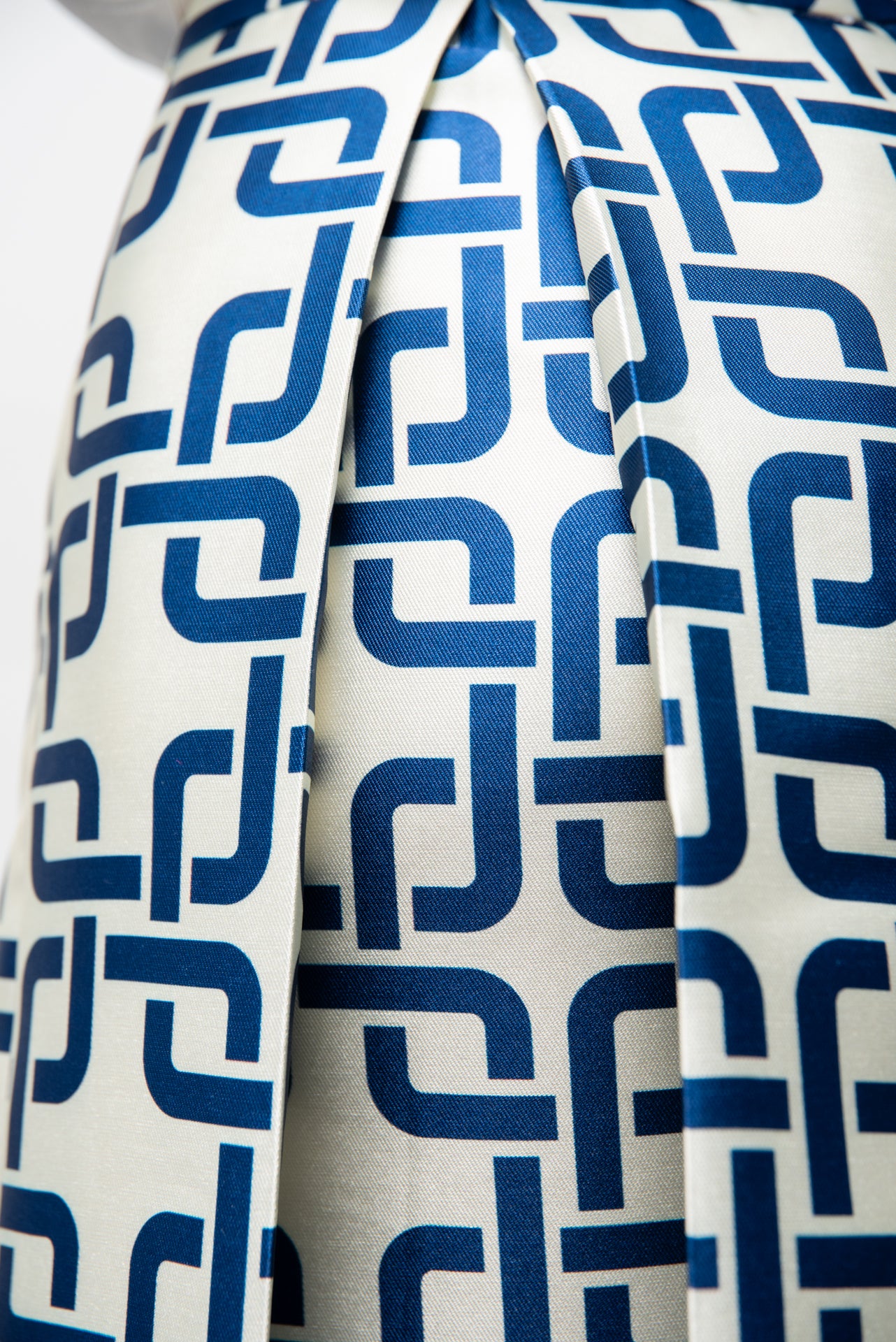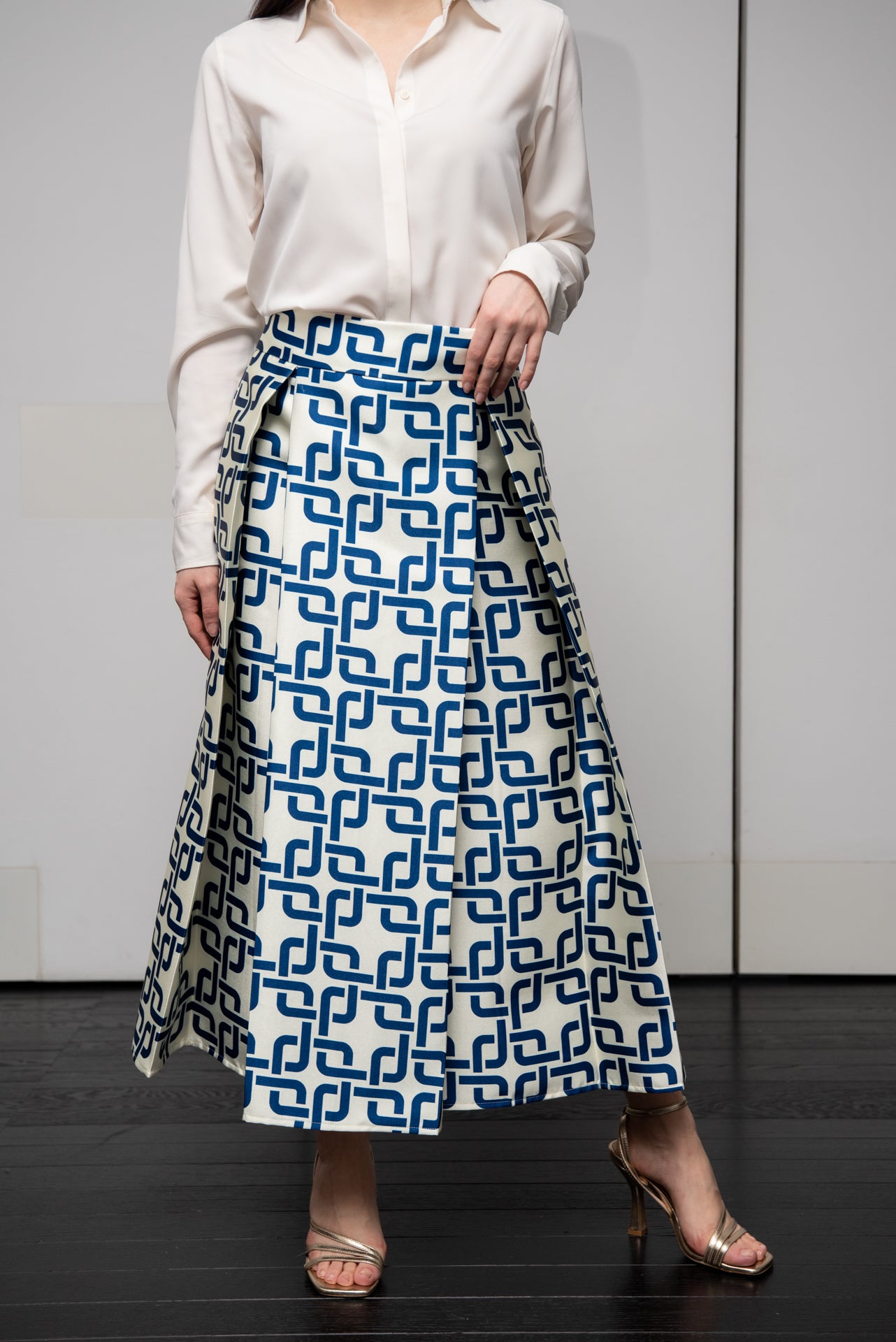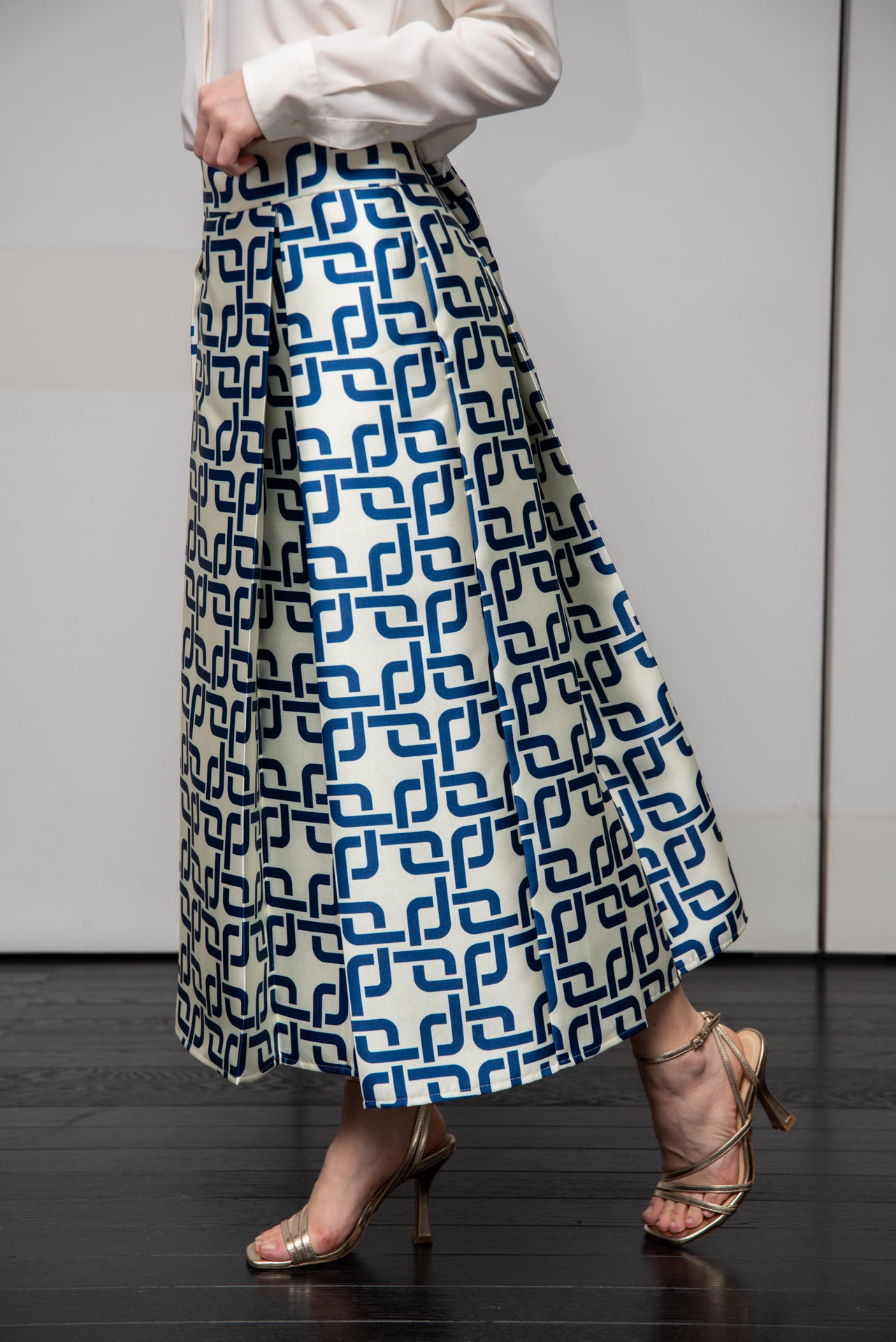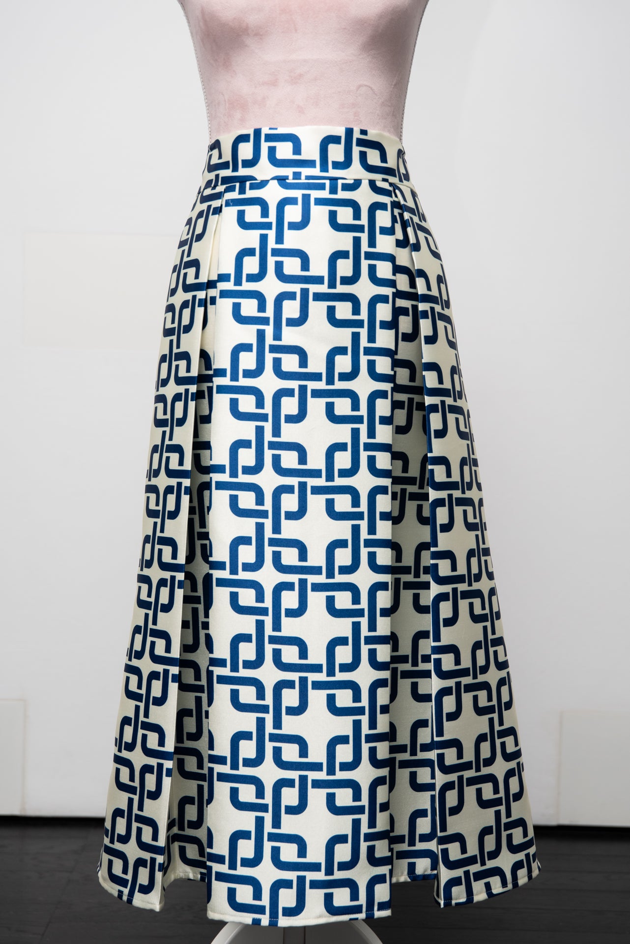 Gonna Modello Robi in tessuto douchesse con disegno geometrico con tasche laterali e pieghe sul davanti questa gonna e’ confezionata su misura quindi la consegna è in 10 giorni lavorativi
