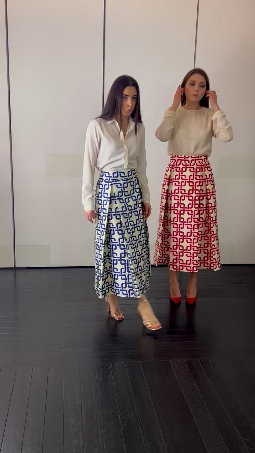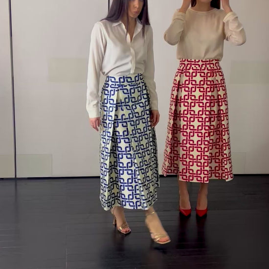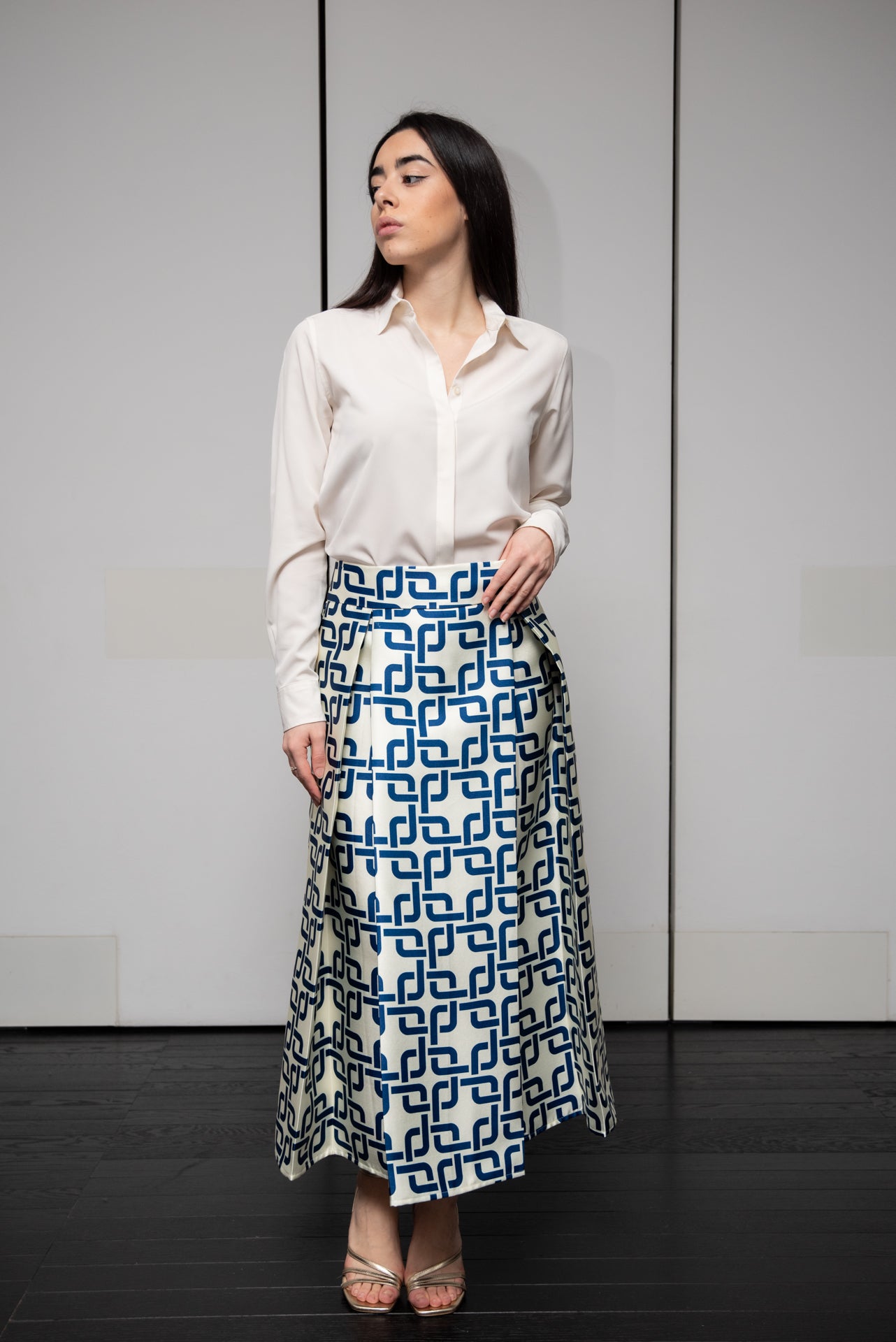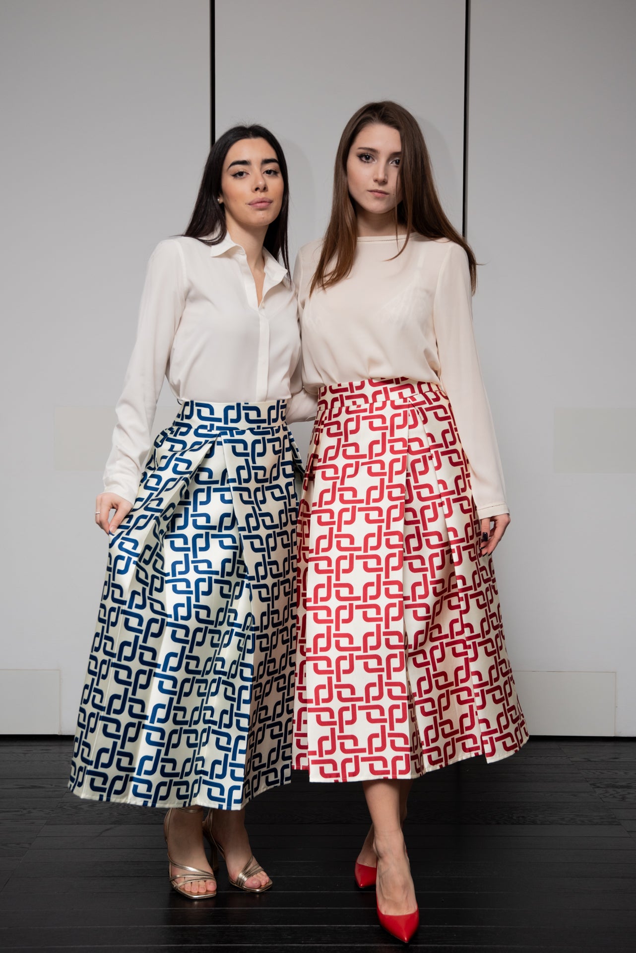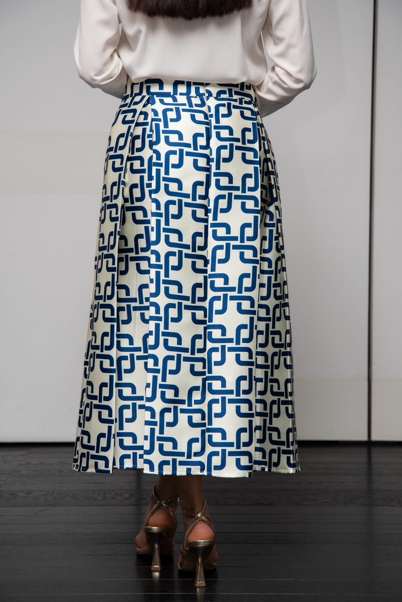 Gonna Modello Robi in tessuto douchesse con disegno geometrico con tasche laterali e pieghe sul davanti questa gonna e’ confezionata su misura quindi la consegna è in 10 giorni lavorativi