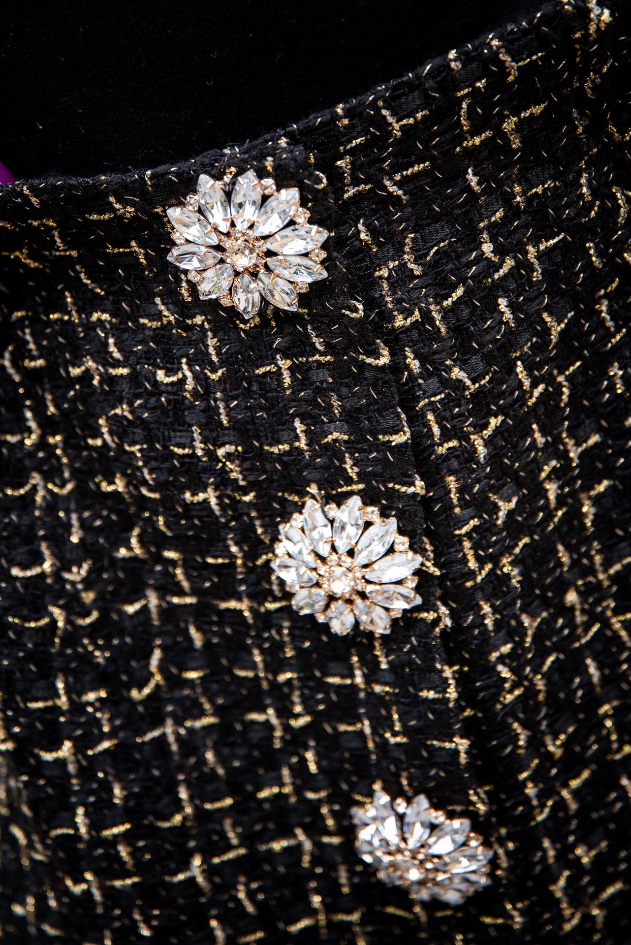 Gonna corta modello Tiziana con elastico in vita in tweed con fili color oro e grossi bottoni gioiello .