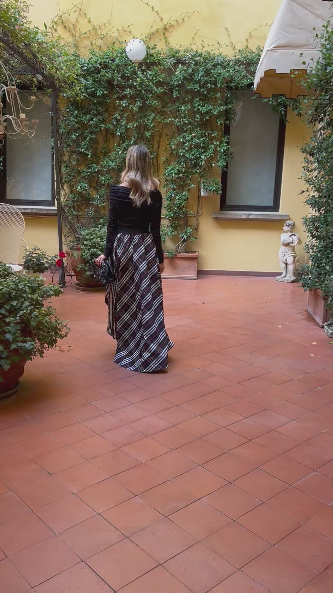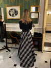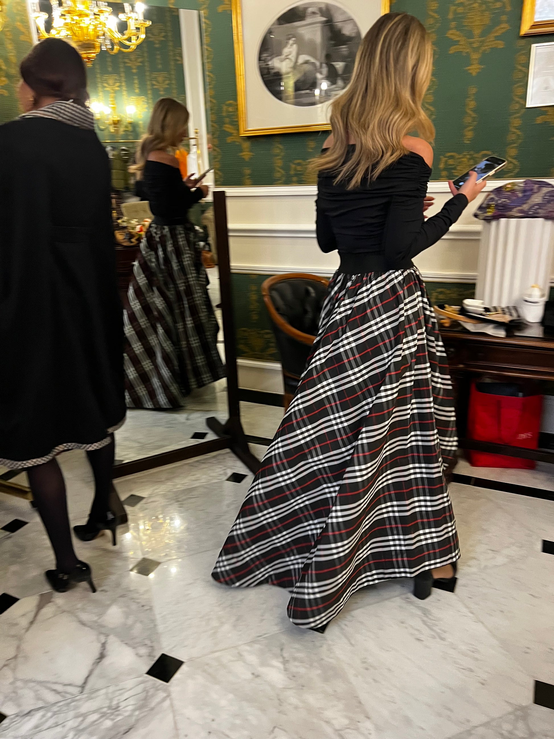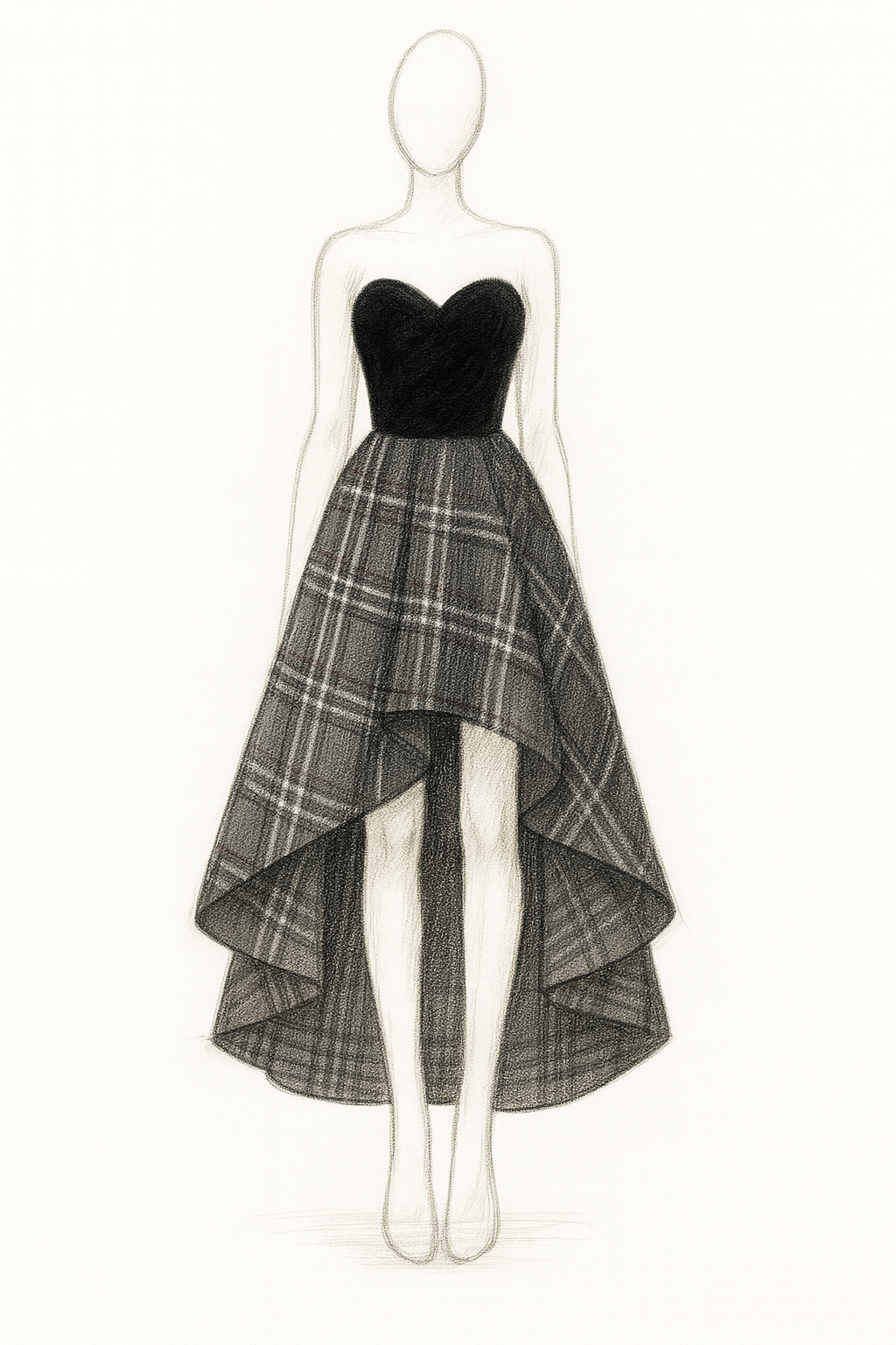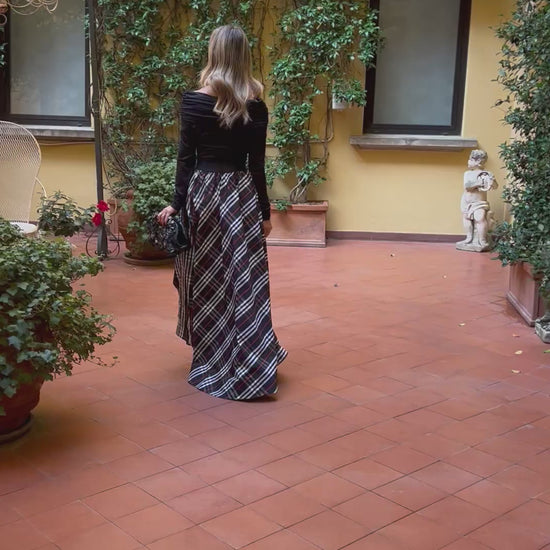 In tartan rosso scozzese, con il suo taglio corto davanti e lungo dietro, crea un movimento spettacolare grazie alla crinolina interna che apre la gonna in modo elegante e scenografico.