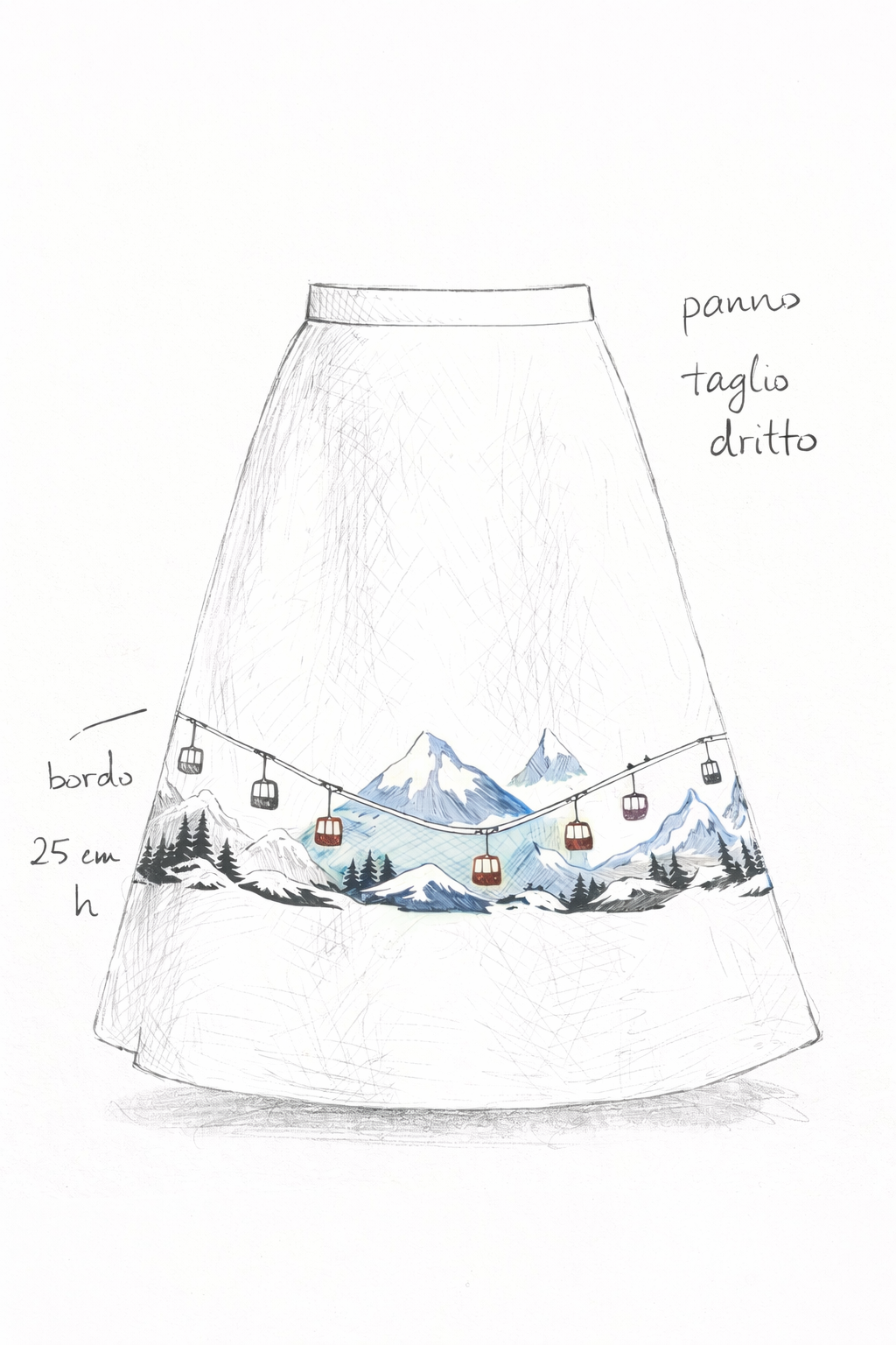 Questo approccio permette un piazzamento preciso del motivo sul fondo e consente di evitare sovrapproduzione e sprechi di tessuto, rendendo ogni gonna unica e non seriale.