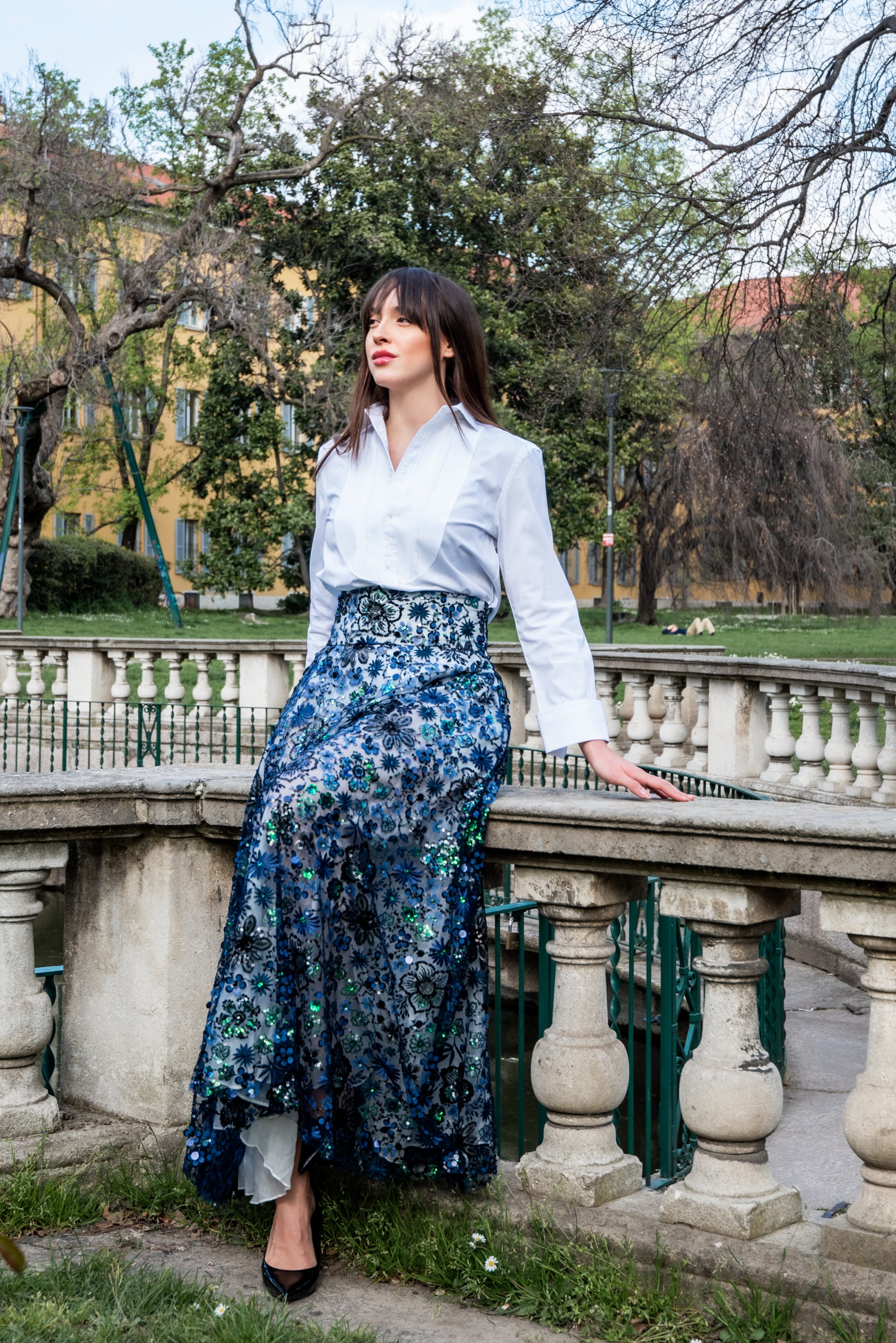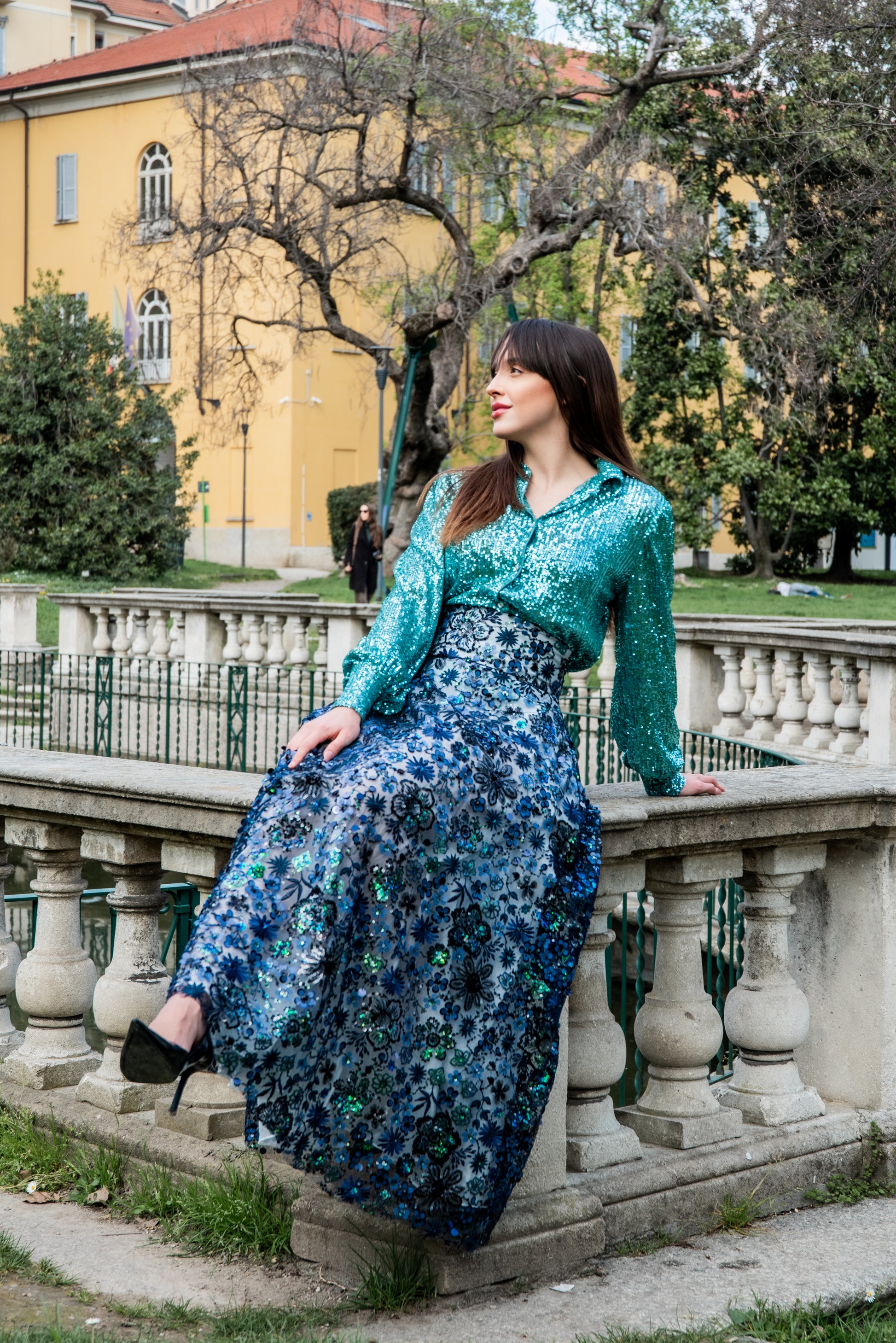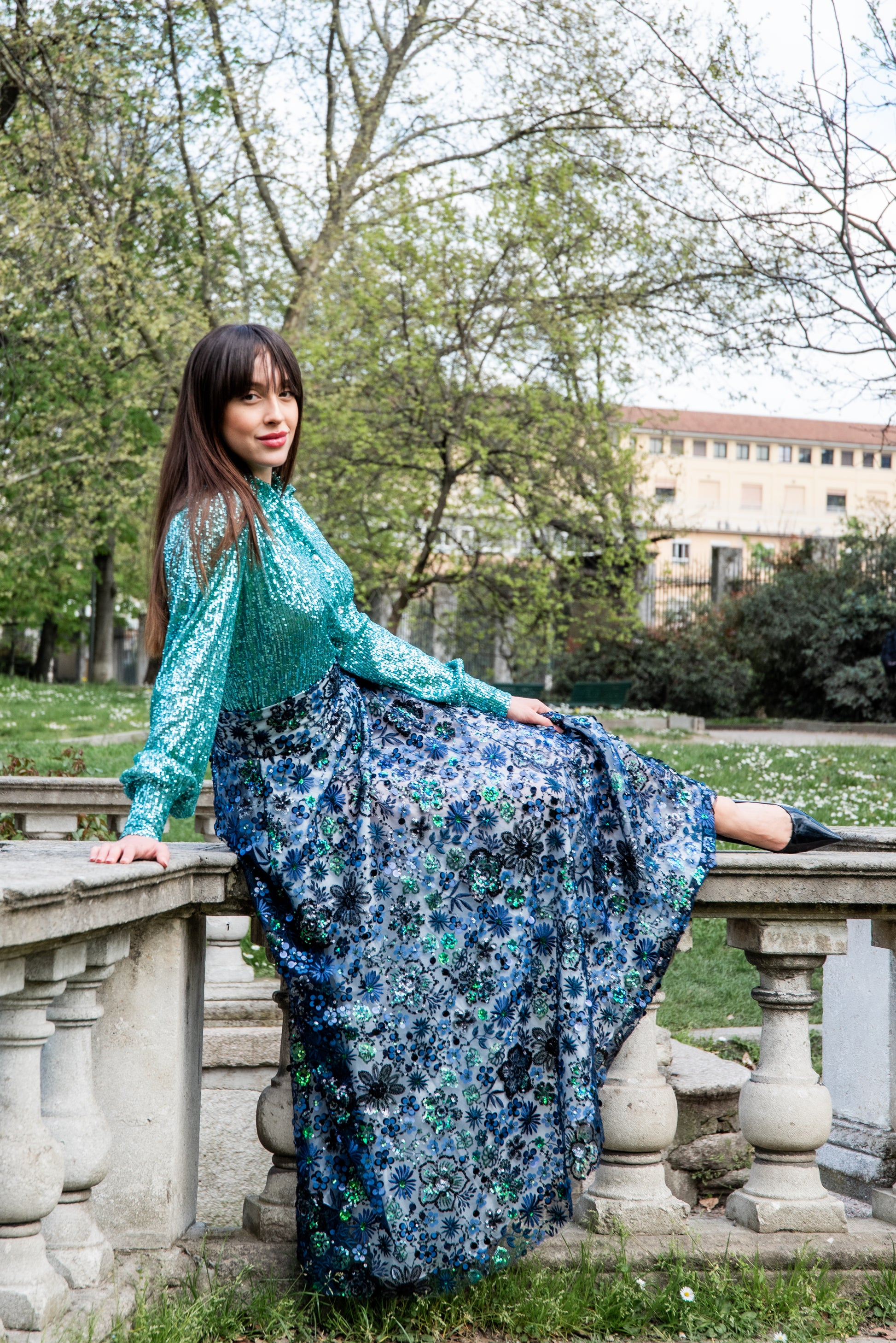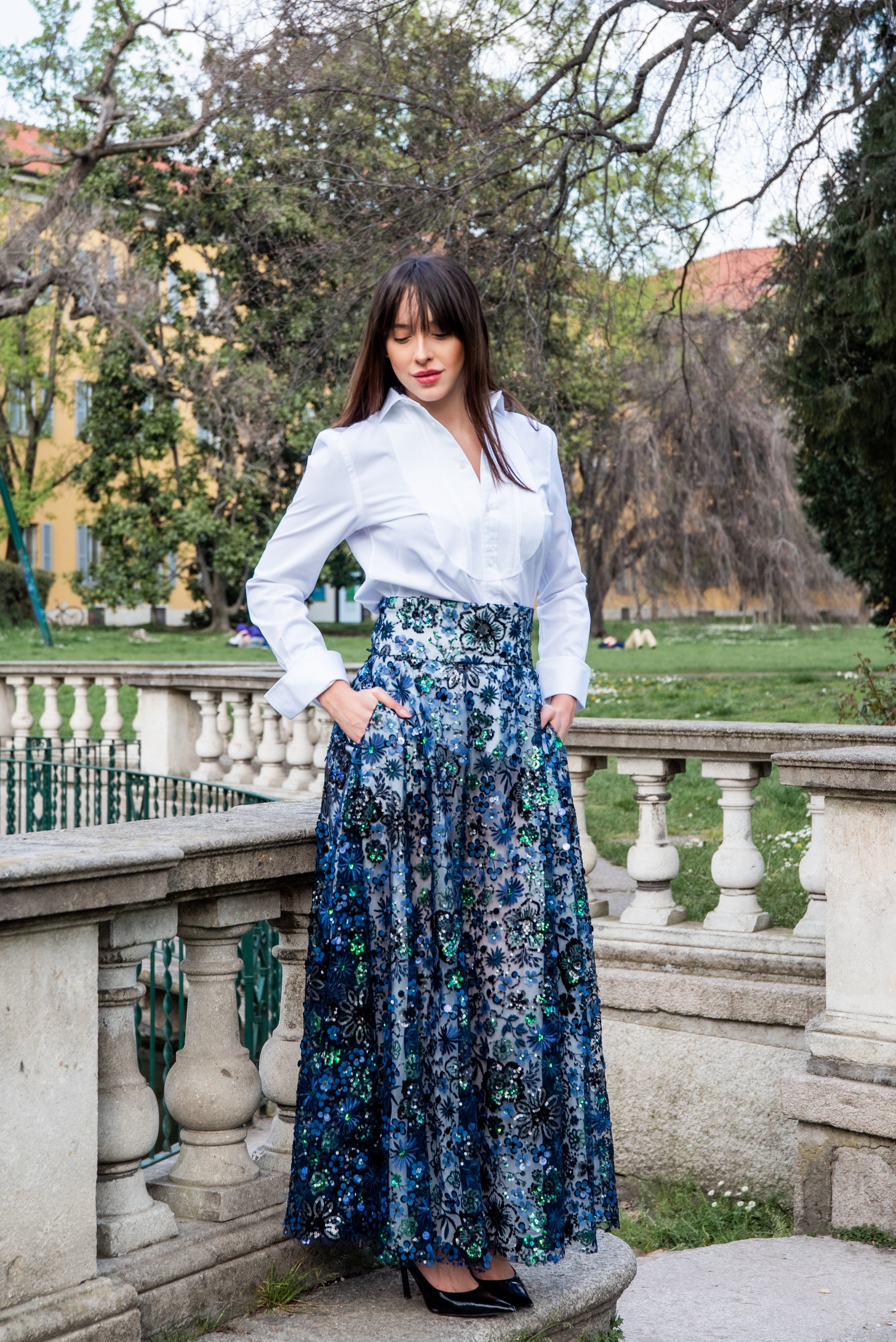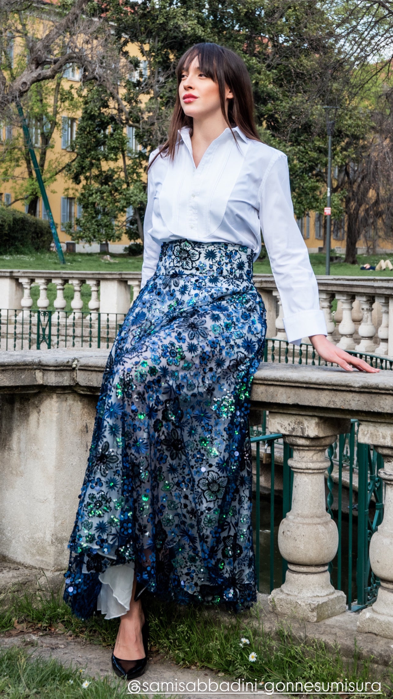 Gonna Valentina LUXURY EDITION a ruota con tessuto in tulle ricamato con paillettes e cristalli blu e verdi con fodera in mussola di cotone bianco o blu realizzata in 15 giorni lavorativi