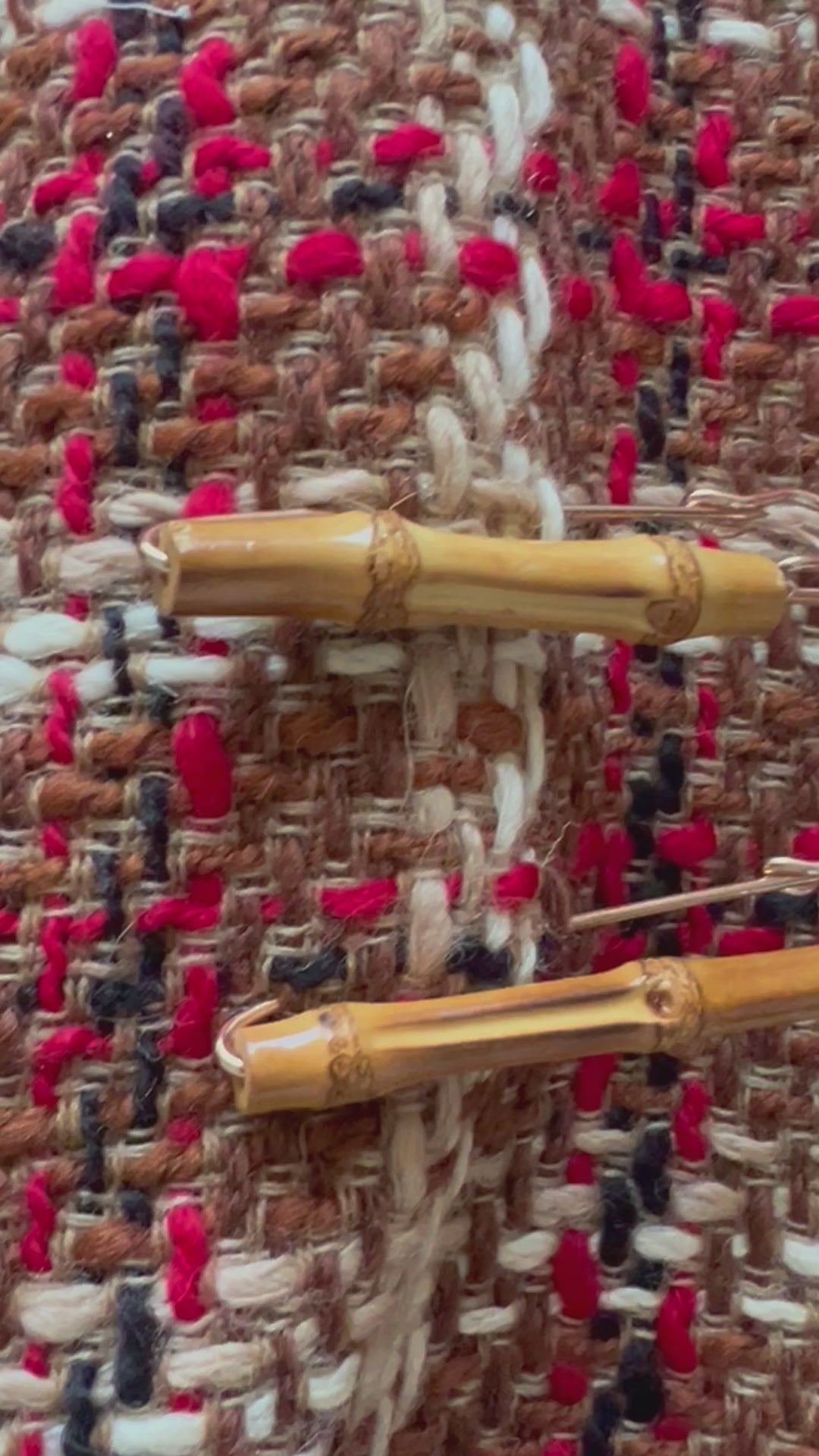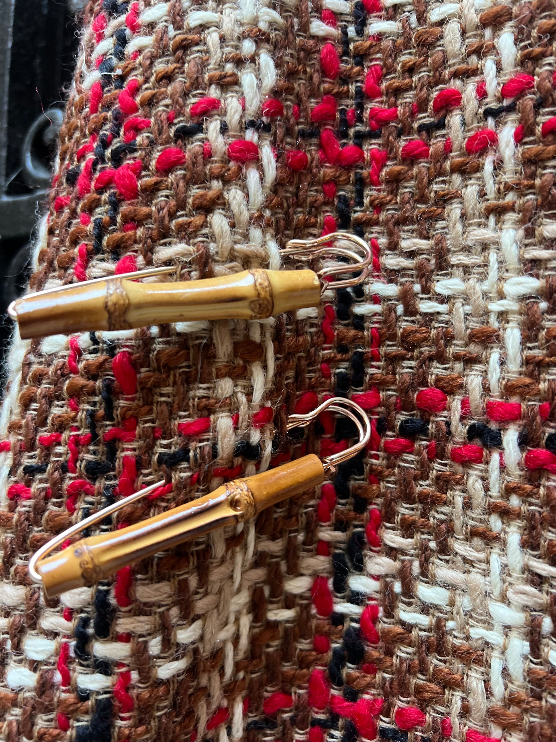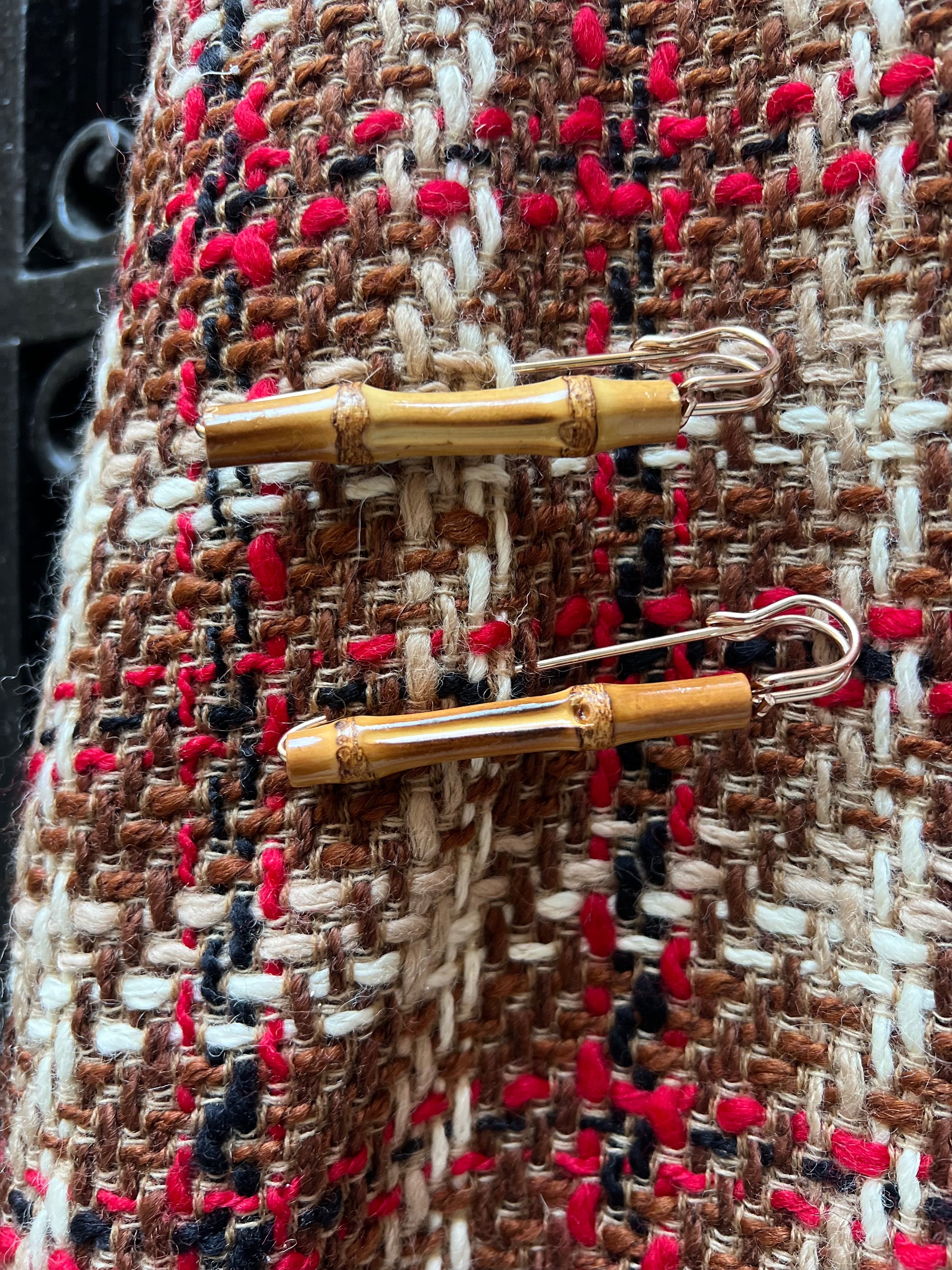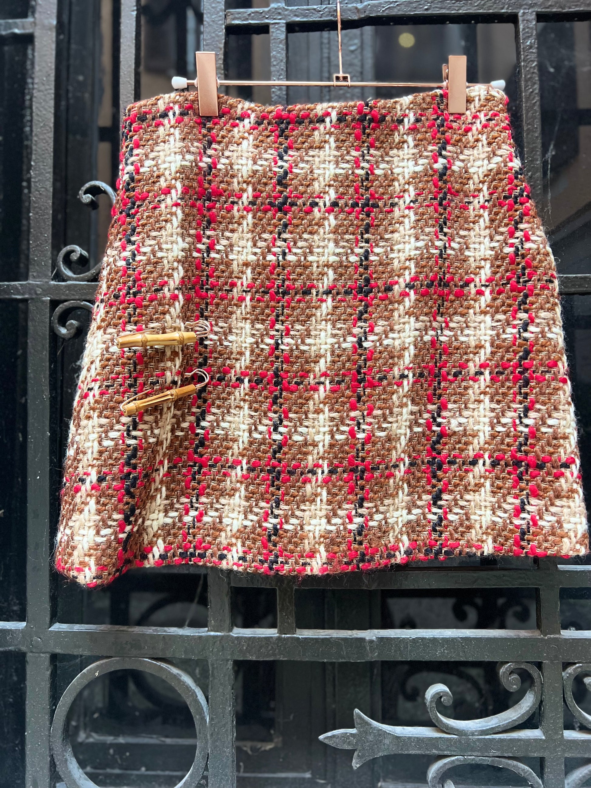 Minigonna Modello monica in tessuto pesantenei toni del beige, rosso Modello ad A con appoggio sui fianchi e spille in legno. Bellissima e molto chic indossata con una camicia in seta Panna o un pull Verde o Bordeaux. Bellissima indossata sia con scarpe con tacco o Stivali
