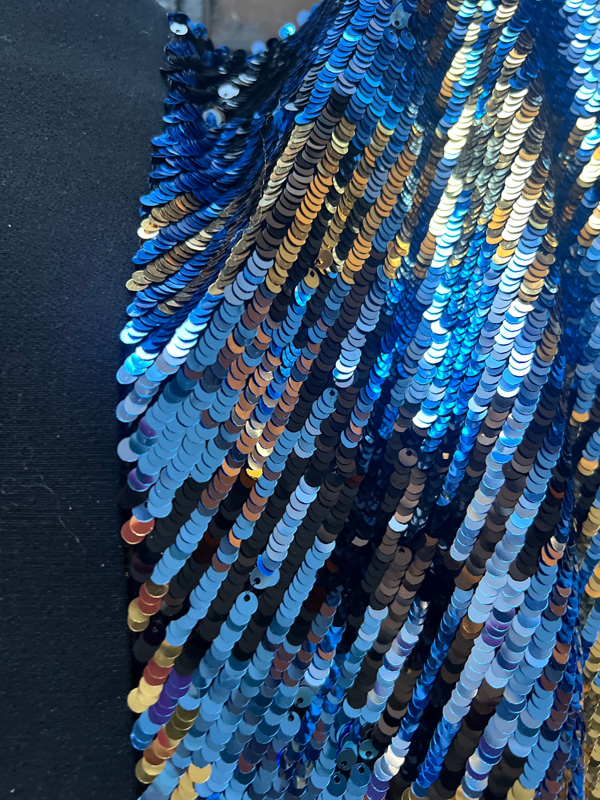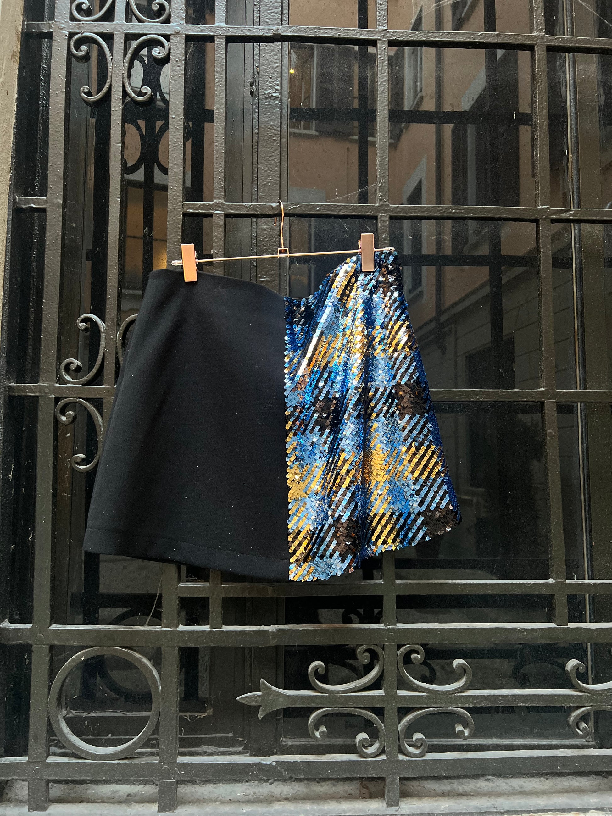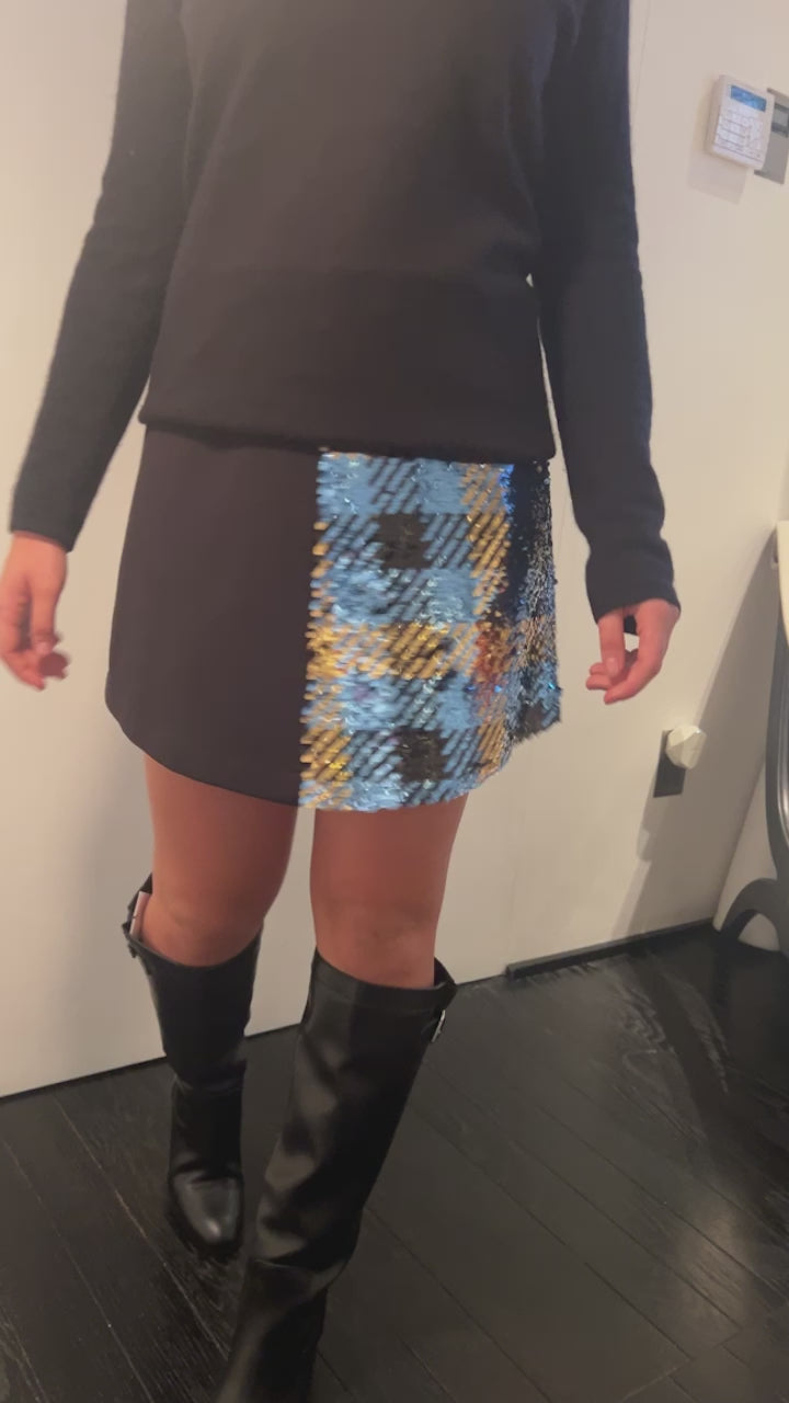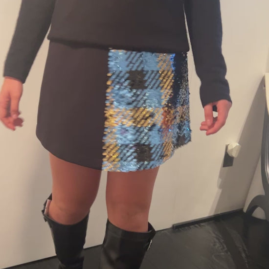 Minigonna Modello monica in tessuto nero e paillettes turchese a scacchi