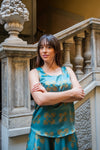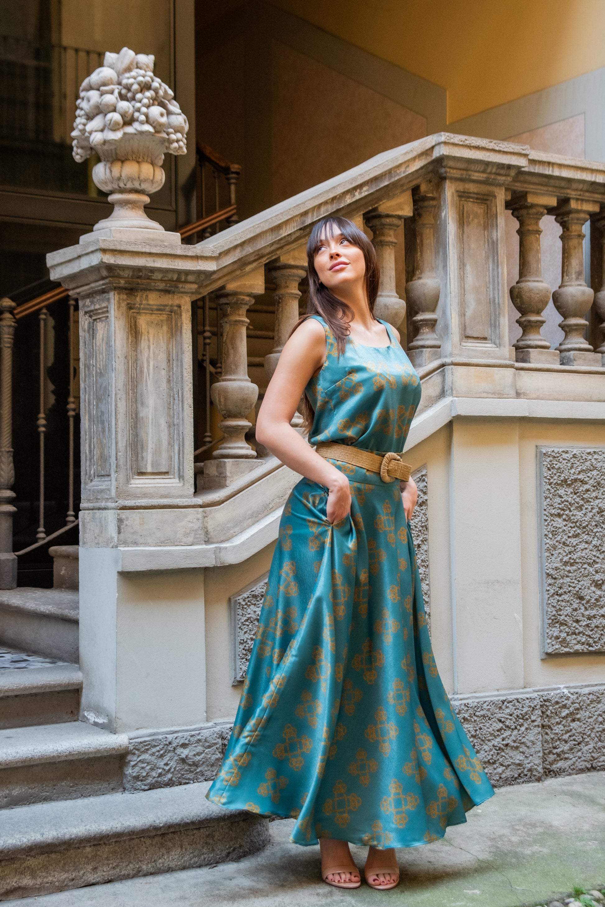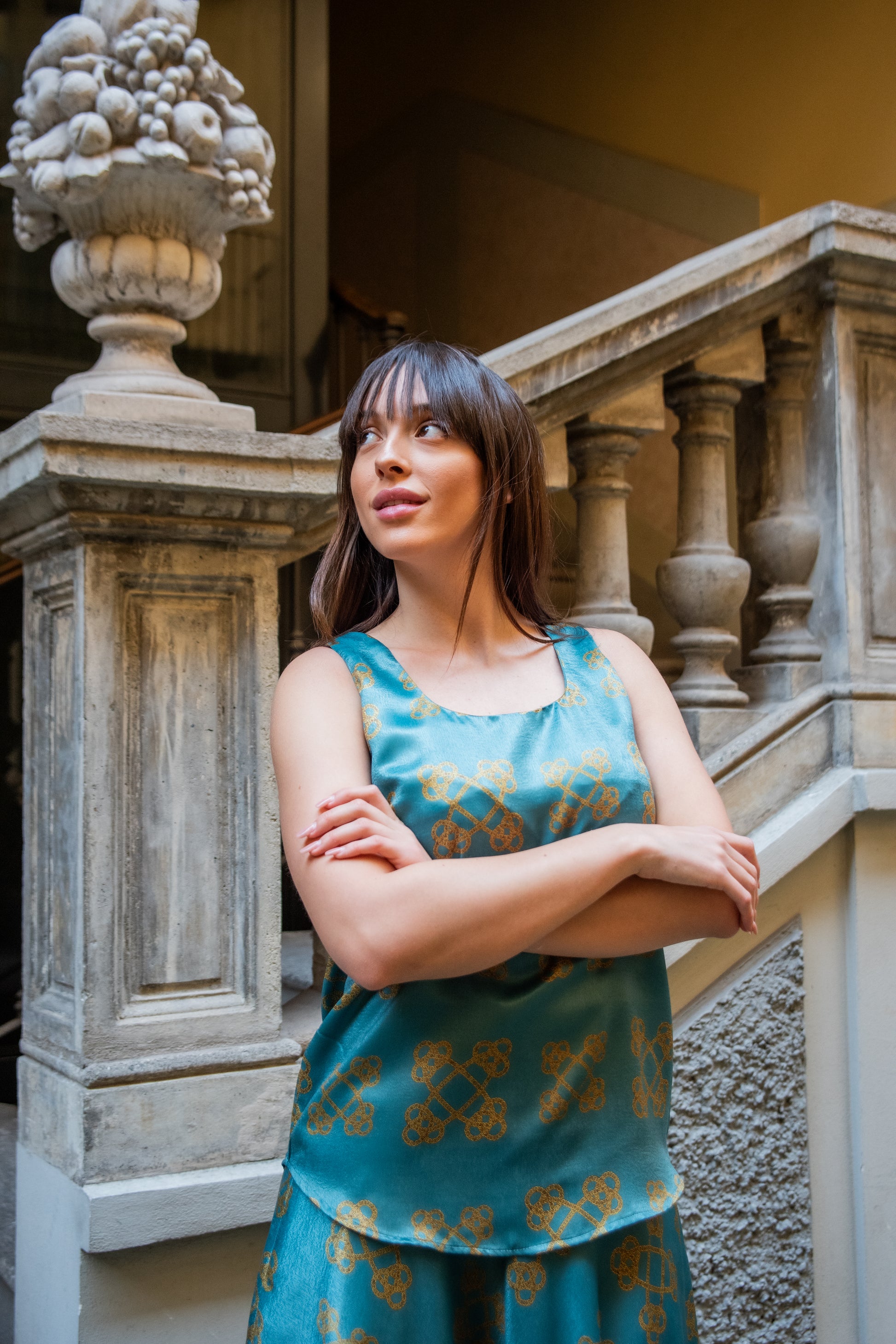 Sleeveless top with a round neckline in soft satin fabric with a chain motif. The color can be made to match the skirt.